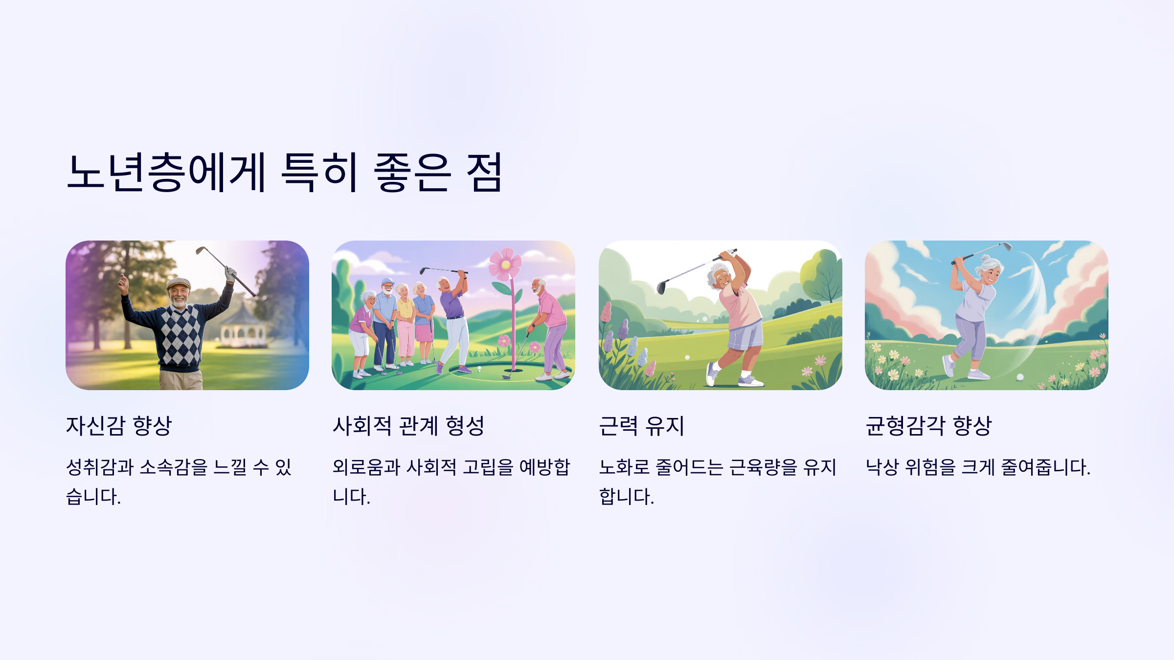노화로 인해 점점 줄어드는 근육량, 유연성, 심폐 기능을 유지하고 향상시키는 데 파크골프만큼 무리가 없고 꾸준히 할 수 있는 운동도 드물어요. 특히 넘어짐 예방에 중요한 하체 근력 유지에 매우 효과적이에요.