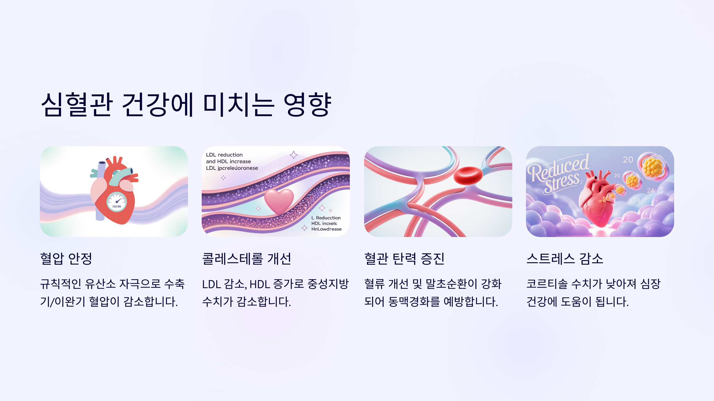 | 혈압 안정 | 규칙적인 유산소 자극 | 수축기/이완기 혈압 감소 |