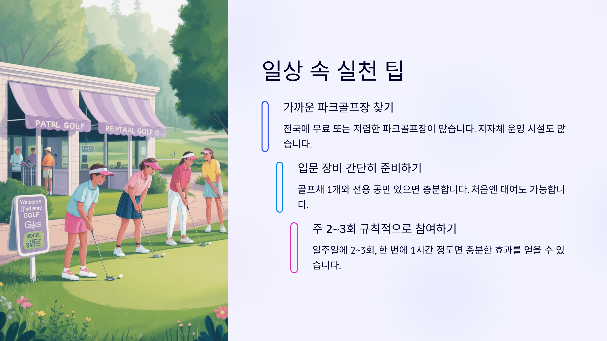 건강·심리·사회적 효과까지 챙길 수 있는 파크골프, 부모님께 꼭 추천해보세요. 이제 마지막으로 일상 속에서 파크골프를 실천하는 팁을 알려드릴게요! ⛳