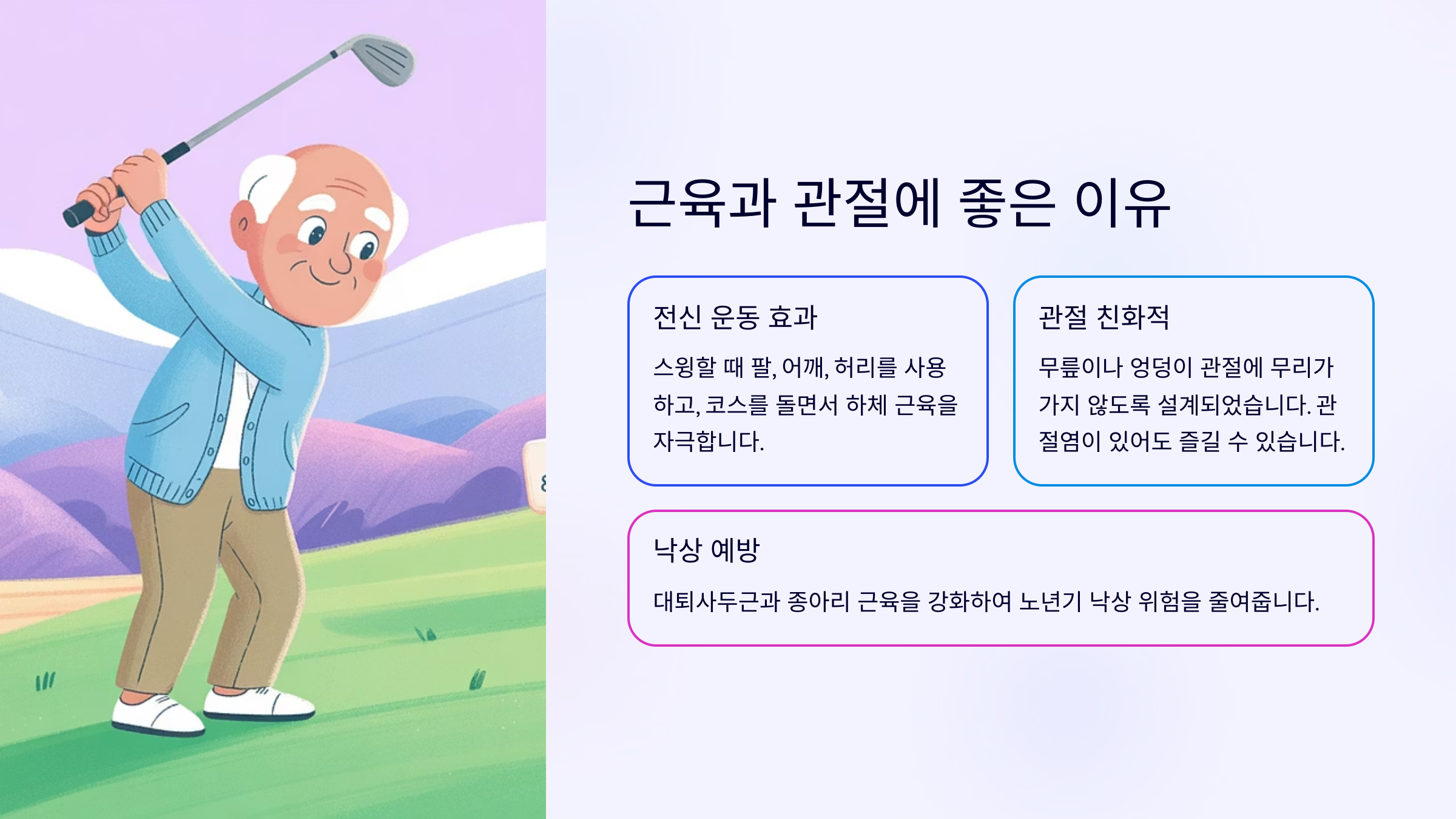 하체 근육이 약해지면 낙상 위험도 올라가는데, 파크골프는 무릎 주위의 대퇴사두근과 종아리 근육을 강화하는 데에도 좋아요. 근육이 탄탄해야 관절도 보호되기 때문에 노년기 운동으로 정말 적합해요.