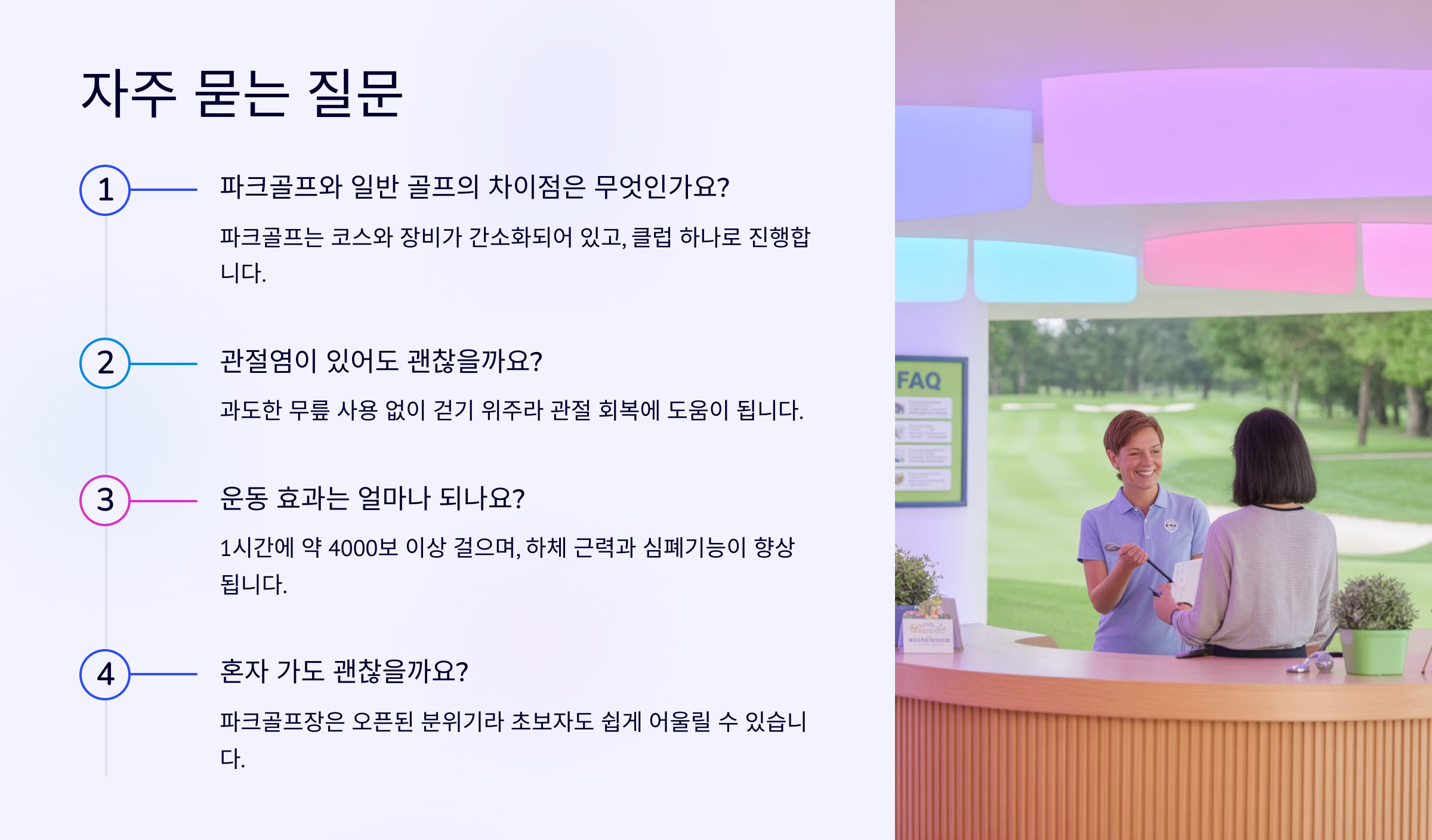 이제 파크골프를 언제, 어디서, 어떻게 시작하면 좋을지 감이 오셨죠? 마지막으로 여러분이 자주 궁금해하는 FAQ 8가지를 모아서 정리해드릴게요! 😊