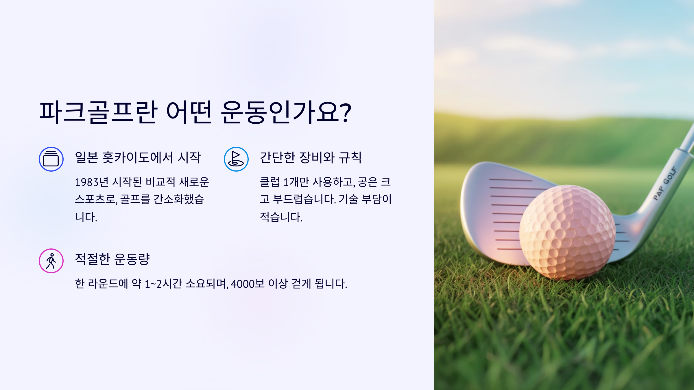 파크골프는 1983년 일본 홋카이도에서 시작된 비교적 새로운 스포츠예요. 기존의 골프에서 룰을 간소화하고, 경기장 크기도 줄여 누구나 쉽게 즐길 수 있게 만든 종목이죠. 이름처럼 공원(park)과 골프(golf)를 합친 개념이에요. 🏞️