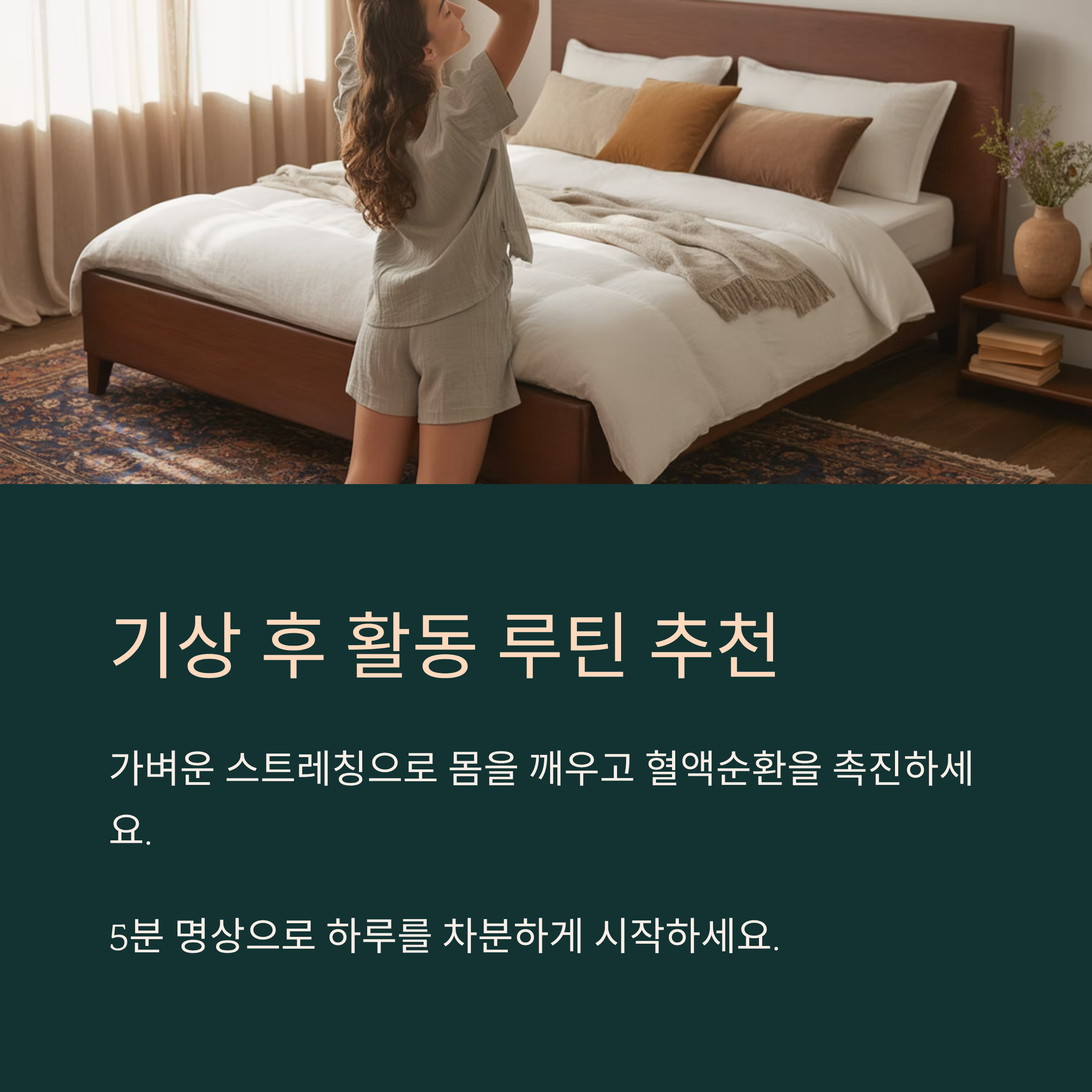 기상 후 몇 분 안에 하는 작은 동작 하나가 하루 전체의 분위기를 결정지을 수 있어요. 아침 루틴은 ‘나를 위한 기지개’예요. 꼭 만들어 보세요!