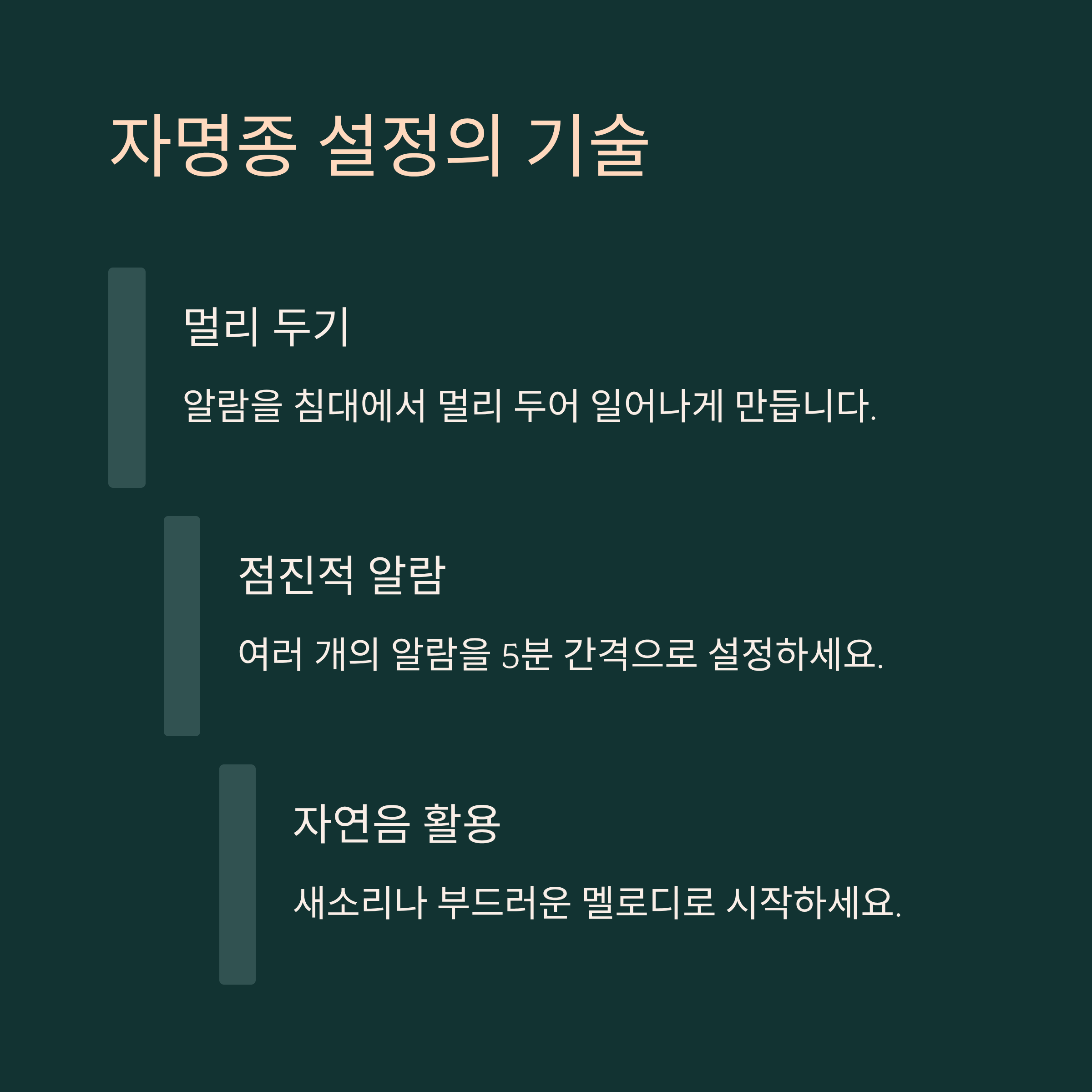 | 알람 위치 | 침대에서 떨어진 곳 | 기상 직후 움직임 유도 |