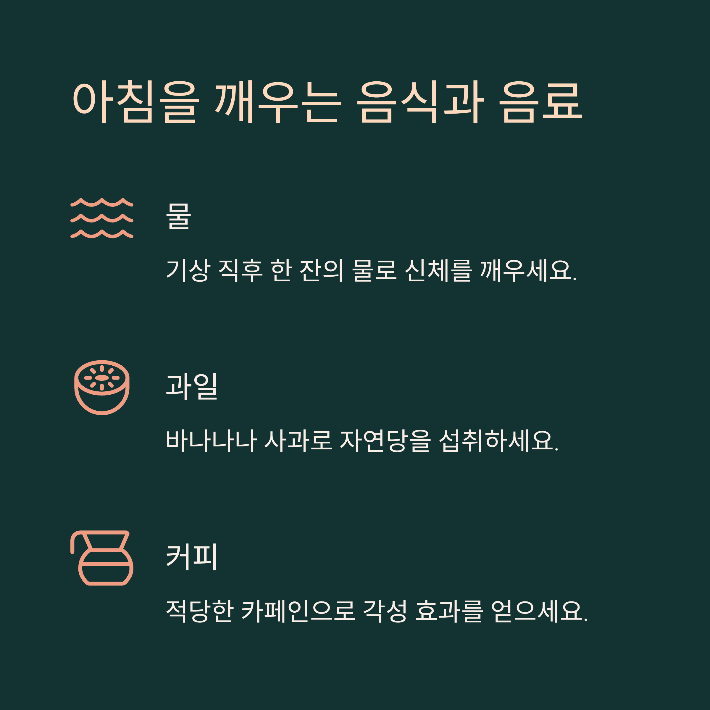 | 블랙커피 | 각성 효과, 집중력 향상 | 기상 30분 후 섭취 |