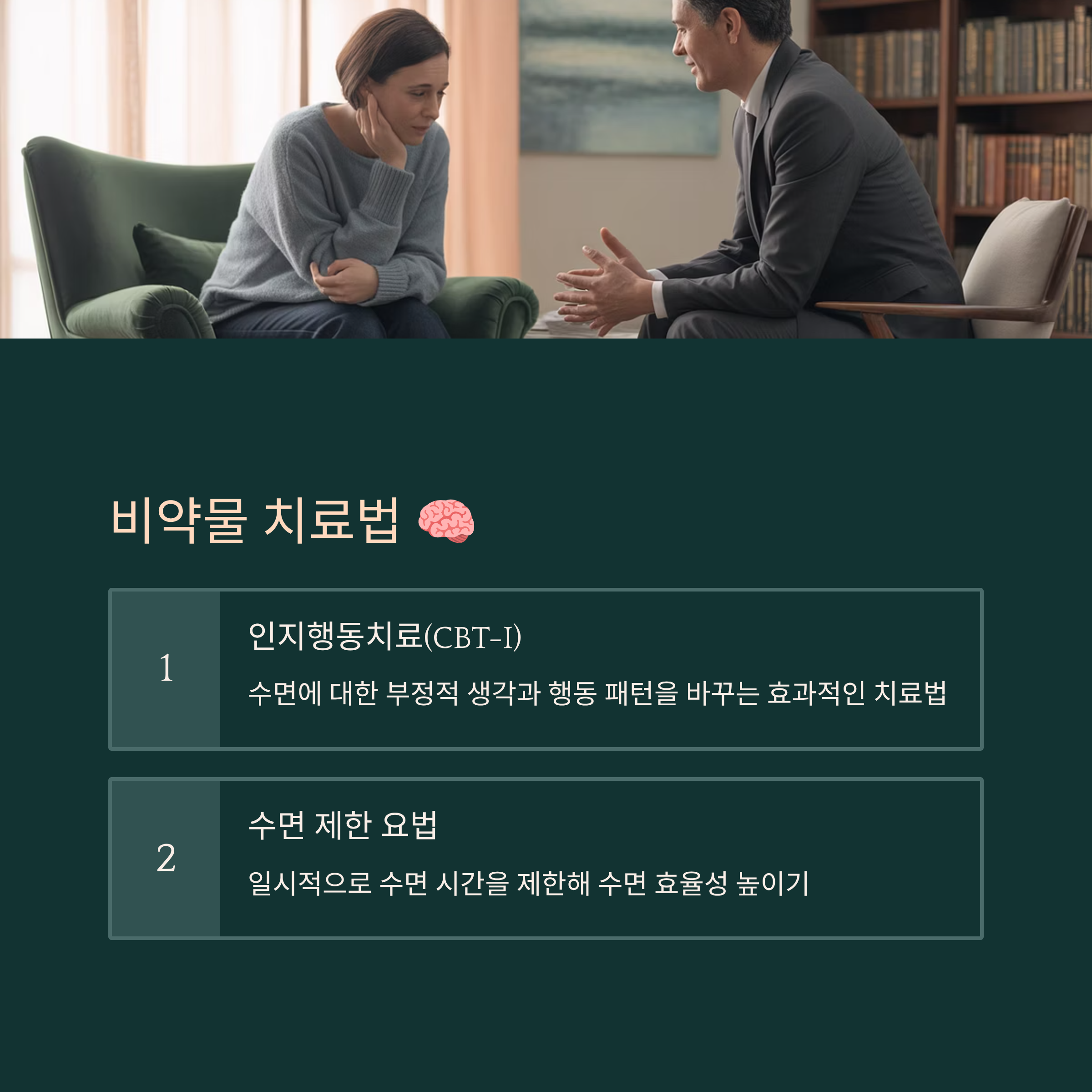 📌 다음 섹션에서는 비약물 치료법과 인지행동치료(CBT-I)를 소개할게요. 약 없이도 과학적 근거를 갖고 효과가 입증된 방법들이 있어요.