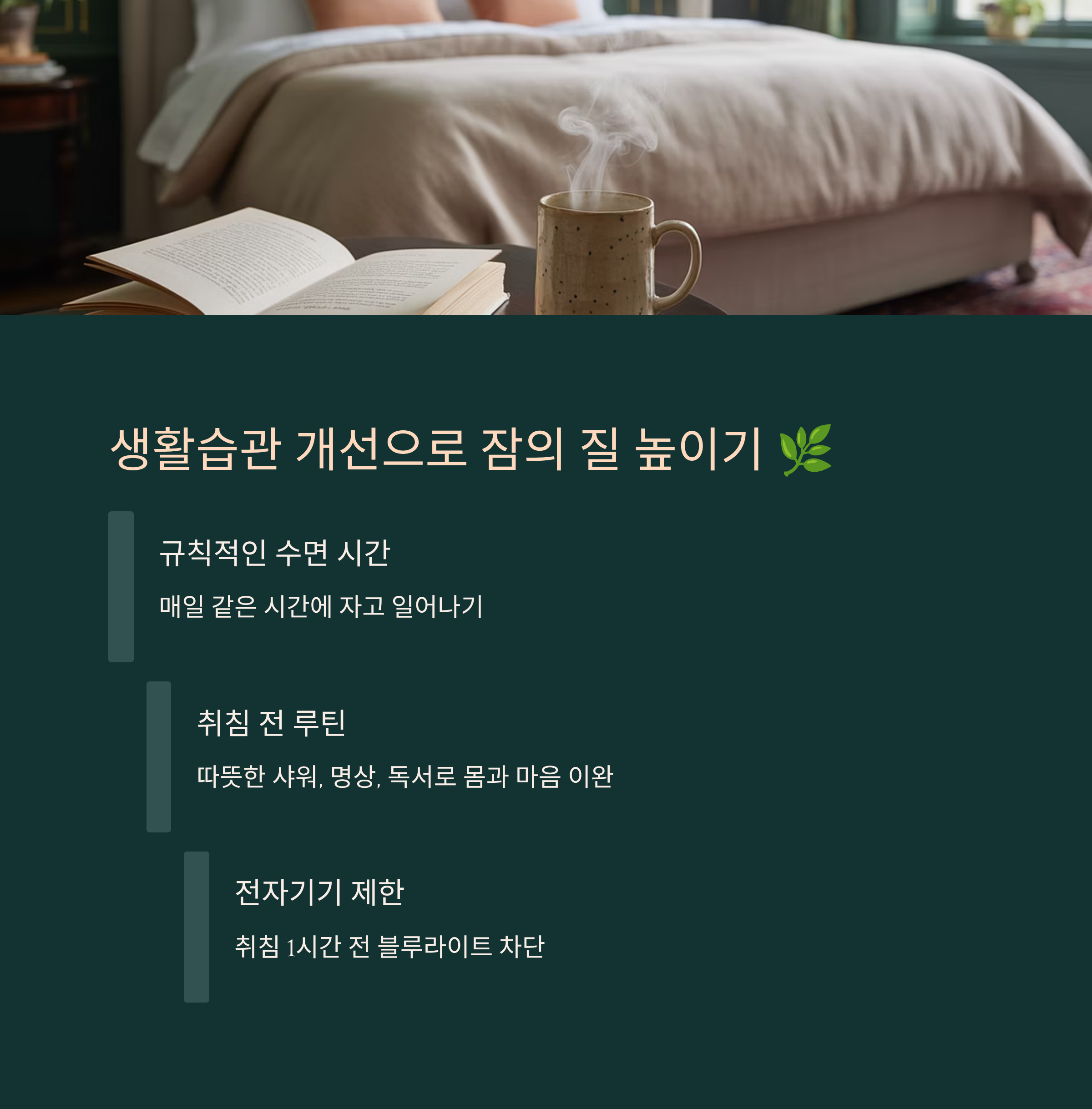 📌 다음 섹션에서는 ‘생활습관 개선으로 잠의 질 높이기’를 다뤄볼 거예요. 약 없이도 불면을 완화할 수 있는 실질적인 방법들이 준비돼 있어요.