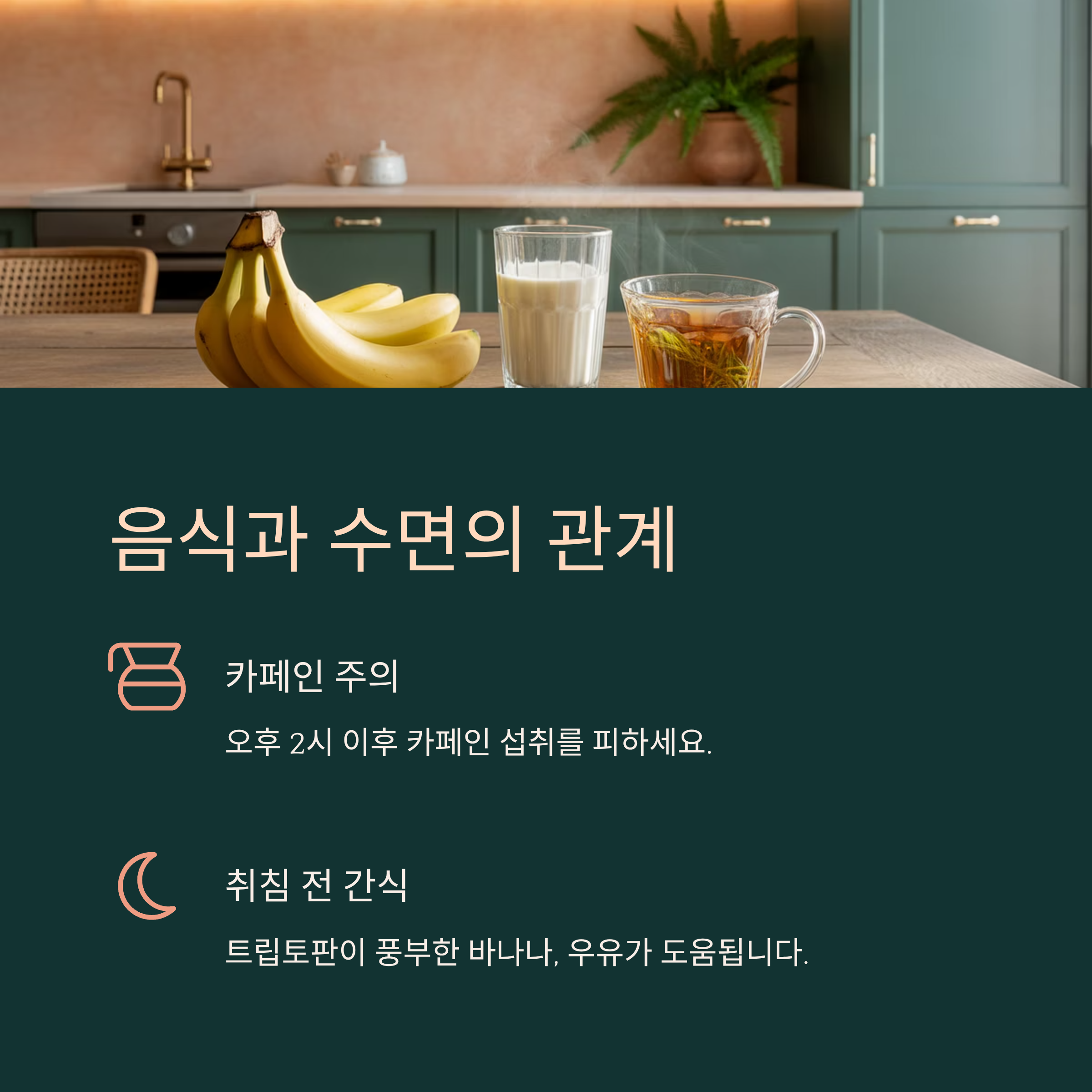 | 수면 유도 | 바나나, 아몬드, 따뜻한 우유, 귀리 | 커피, 초콜릿, 탄산음료, 튀김류 |