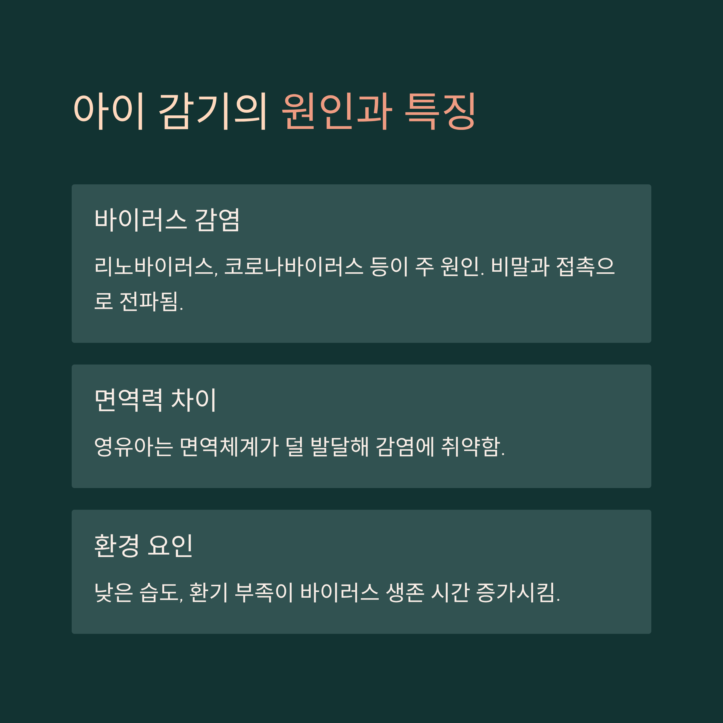 아이 감기는 대부분 바이러스에 의해 발생해요. 특히 리노바이러스, 코로나바이러스, 아데노바이러스 등이 주된 원인이에요. 이 바이러스들은 공기 중 비말이나 손을 통한 접촉으로 쉽게 전파돼요. 아이들이 유치원이나 어린이집에서 친구들과 장난감을 공유하거나 가까이서 놀다 보면 감기에 걸릴 확률이 높아지죠.