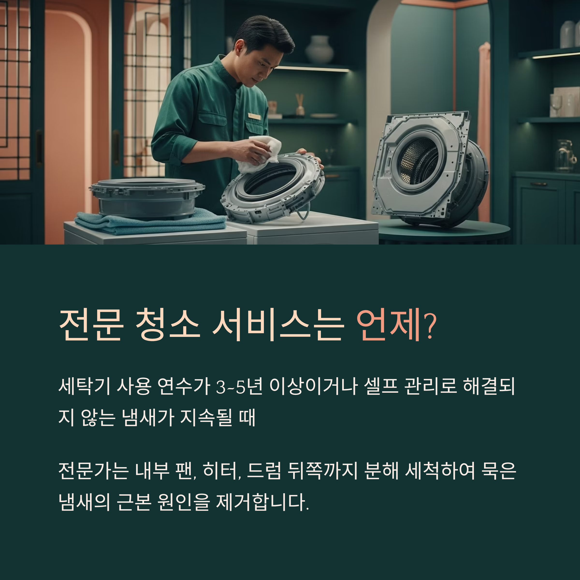 세탁기 냄새가 오래 지속되거나 셀프로 관리했는데도 효과가 없다면 전문 청소 서비스를 고려해도 좋아요. 분해 세척은 일반 가정에서 하기 어려운 내부 팬, 히터 주변, 세제 투입구 뒤편, 드럼 뒤쪽까지 깨끗하게 청소해 주기 때문에 묵은 냄새의 근본 원인을 제거해요.