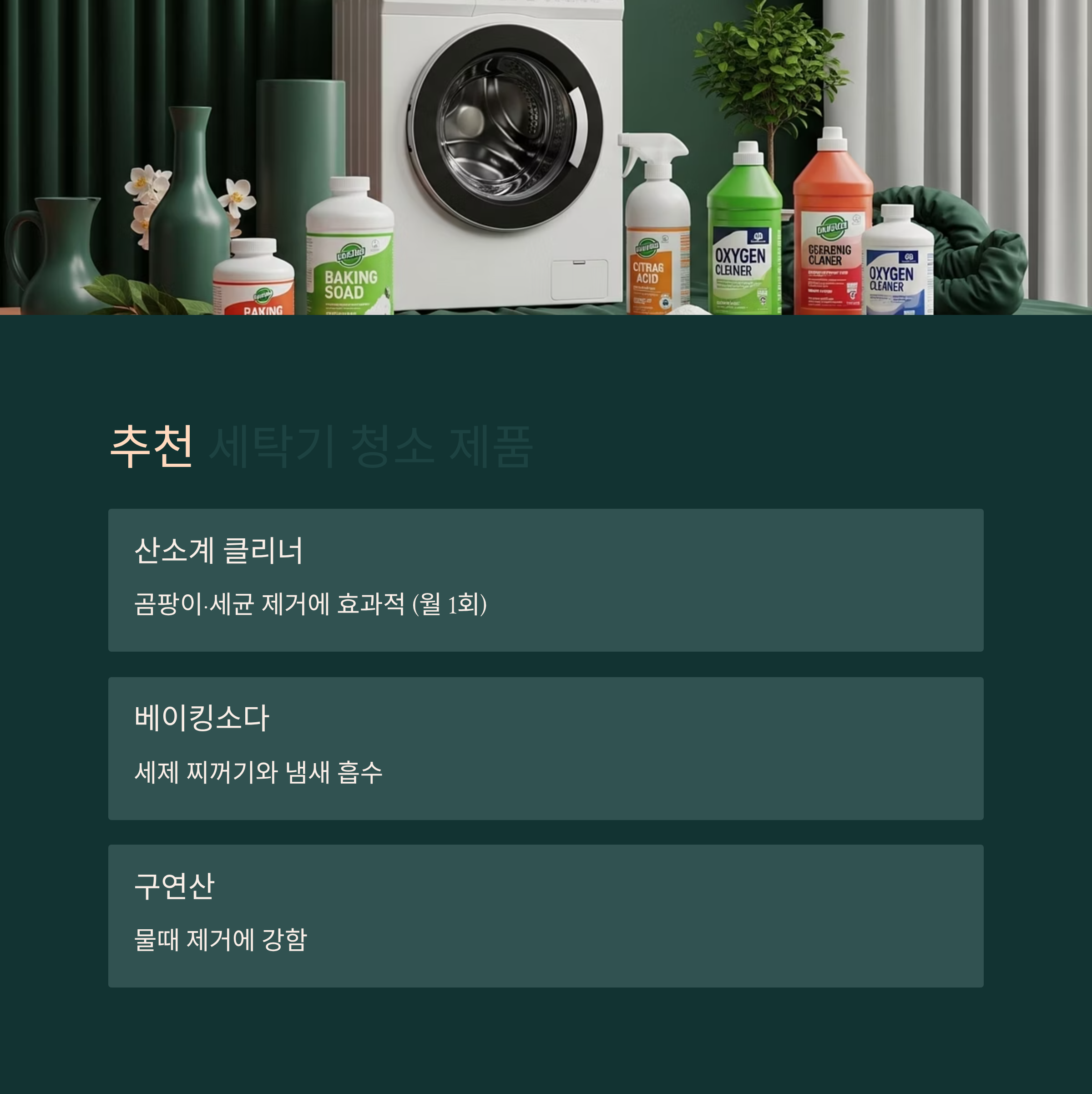 | 세탁조 클리너(염소계) | 차아염소산나트륨 | 강력 살균·탈취 | 2~3개월 1회 |