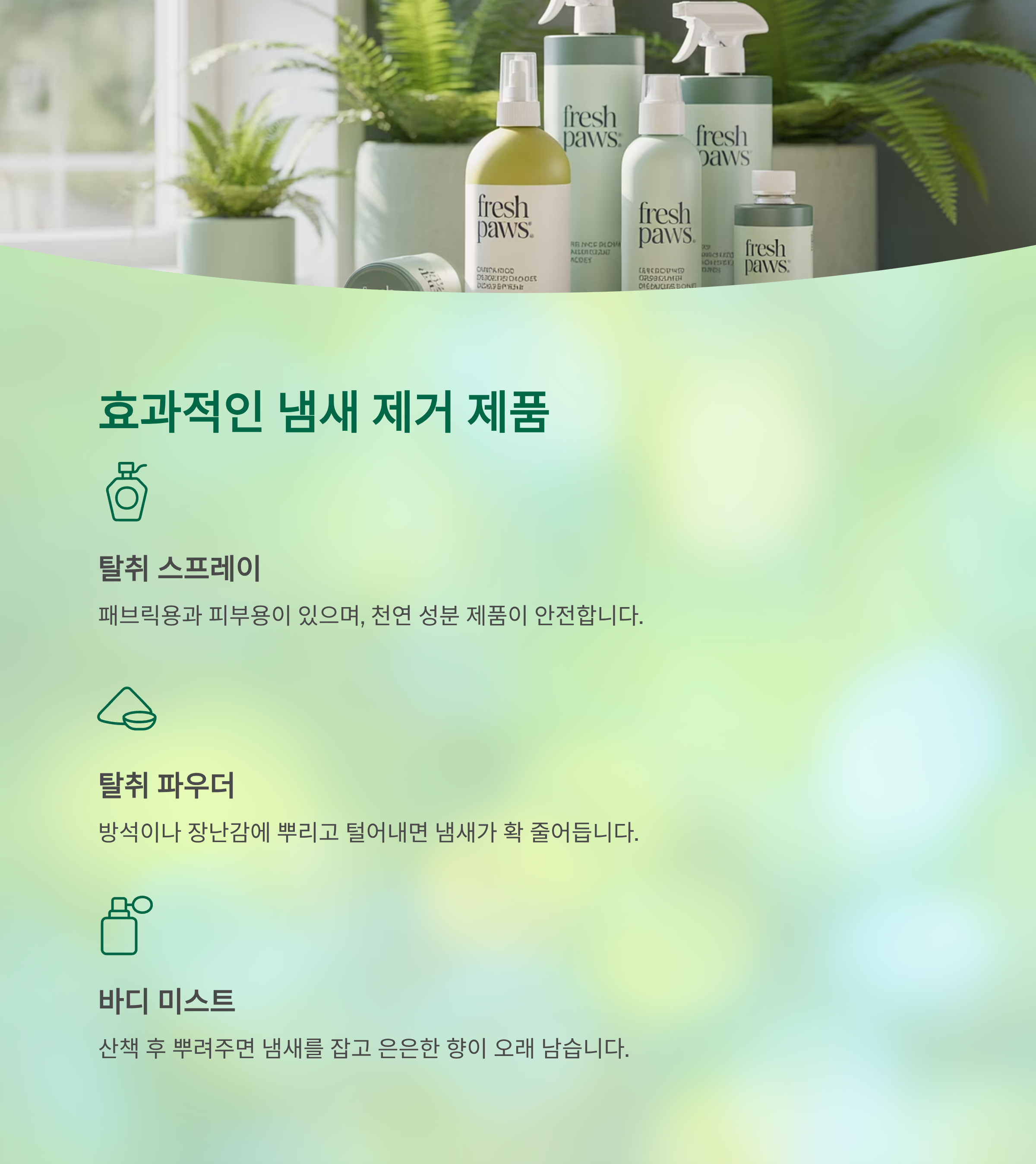 시중에는 강아지 냄새 제거를 위한 다양한 제품들이 나와 있어요. 그 중에서도 가장 인기가 많은 건 탈취 스프레이예요. 패브릭용, 피부에 직접 뿌리는 타입 등 용도에 따라 종류가 달라요. 성분은 천연 유래가 포함된 제품이 안전하답니다.