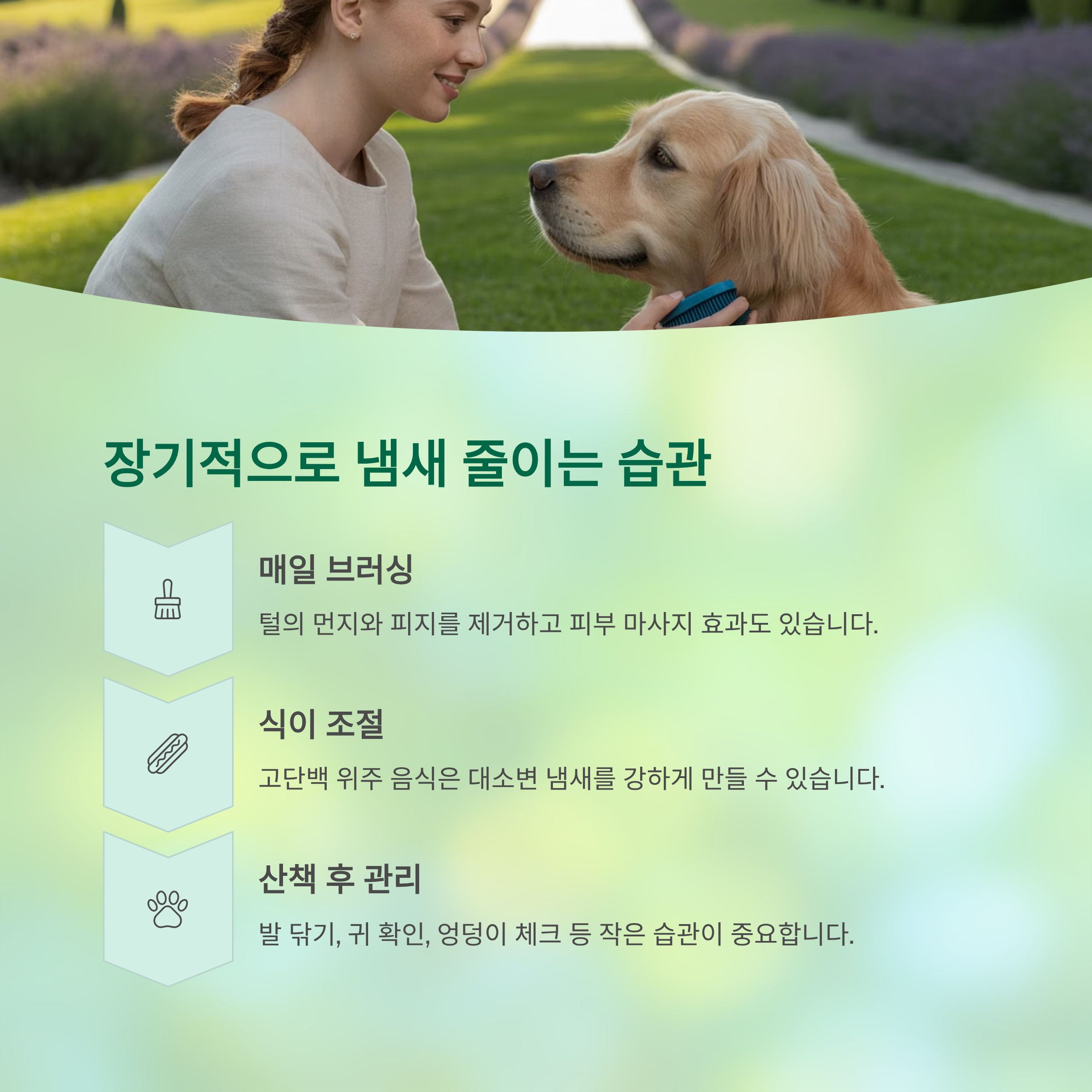 매일 브러싱을 해주는 것도 큰 도움이 돼요. 털에 묻은 먼지와 피지를 제거해주면서 자연스럽게 냄새도 줄어요. 브러싱은 털 빠짐도 줄여주고 피부 마사지 효과도 있어서 일석이조예요!