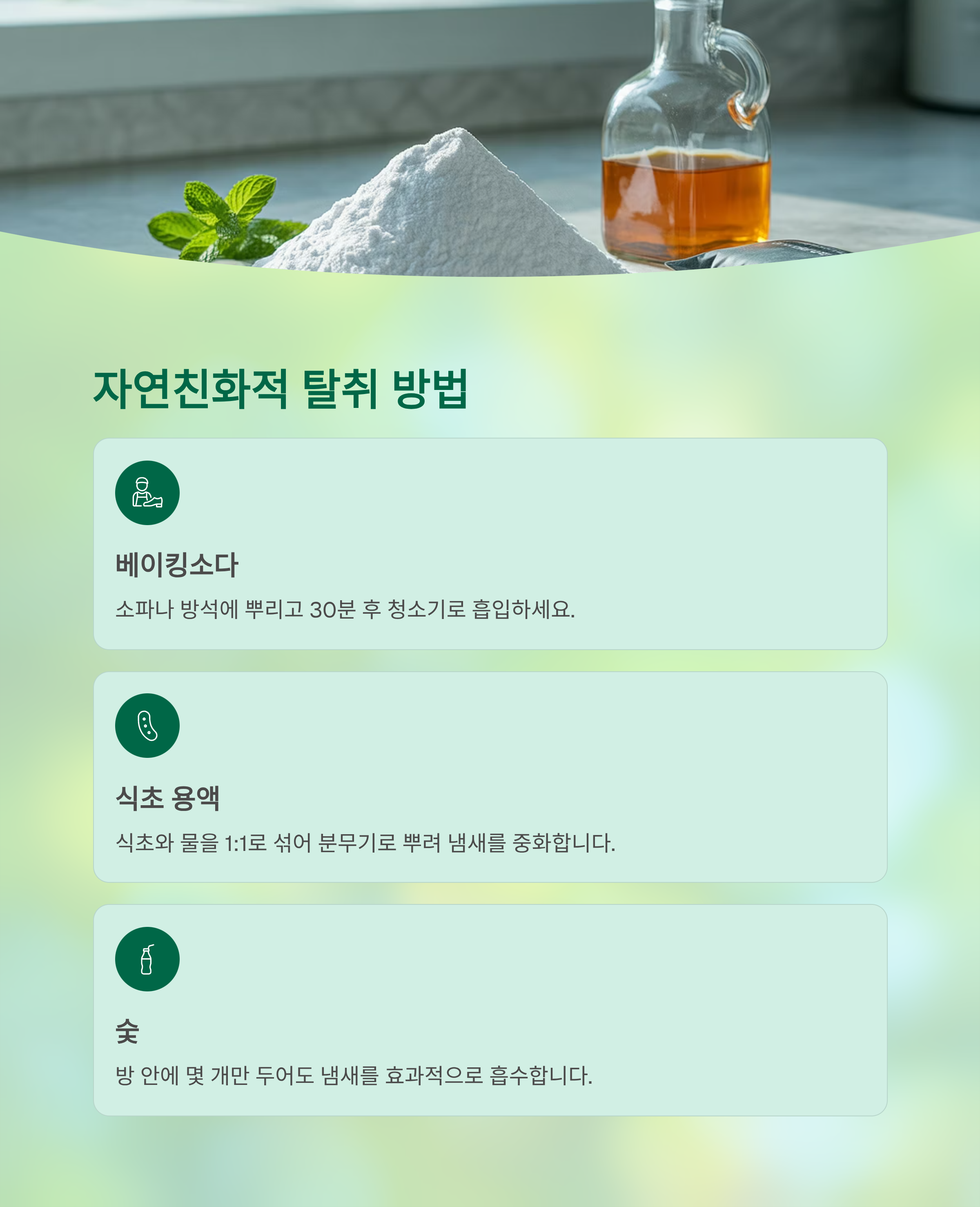 또한 식초와 물을 1:1로 섞은 용액도 매우 효과적이에요. 분무기로 커튼이나 바닥에 살짝 뿌려주면 산성 성분이 냄새를 중화해주죠. 하지만 식초 냄새가 싫다면, 여기에 레몬 껍질이나 라벤더 오일을 몇 방울 떨어뜨려주면 기분 좋은 향으로 바뀌어요 🍋
