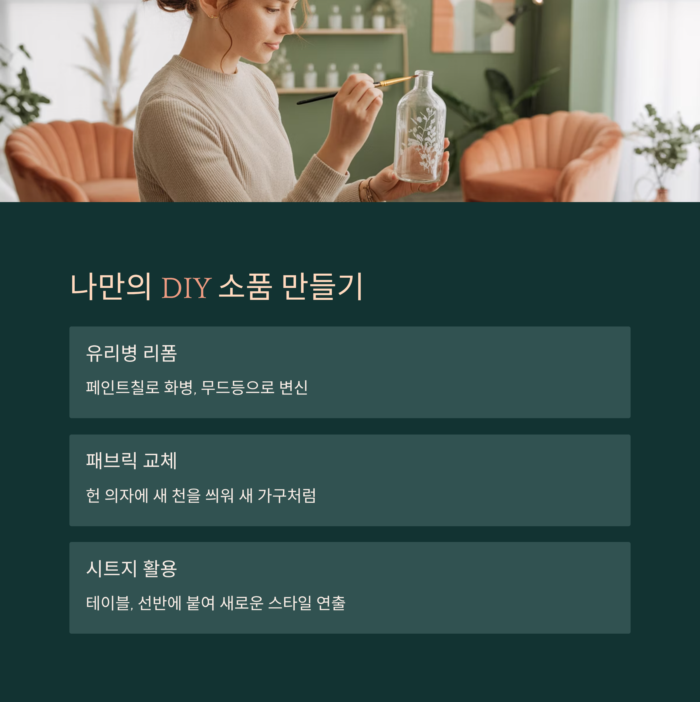 A4. 네, 간단한 유리병 화병, 가랜드, 페인트 리폼 정도는 초보자도 쉽게 만들 수 있어요. 유튜브나 블로그에 초보자용 튜토리얼도 많답니다.