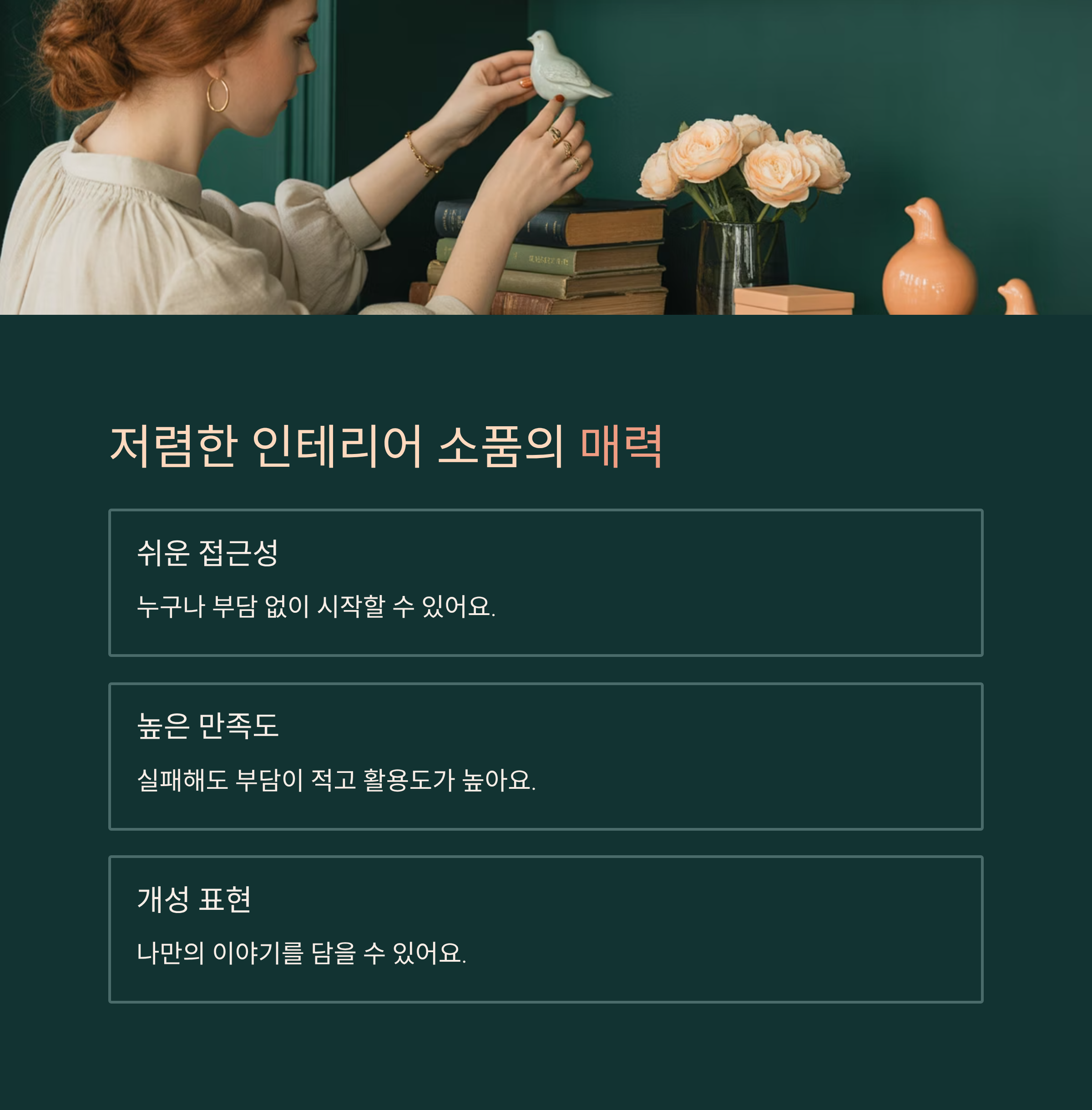 이제 목차에서 본 것처럼, 저렴한 인테리어 소품의 매력부터 활용 방법, DIY 아이디어까지 하나씩 살펴보면서 여러분의 공간을 더 특별하게 꾸밀 수 있는 방법을 소개해 드릴게요. 지금은 인트로와 목차만 나왔고, 이어서 각 섹션별로 풍부한 내용이 자동으로 출력될 예정이에요!