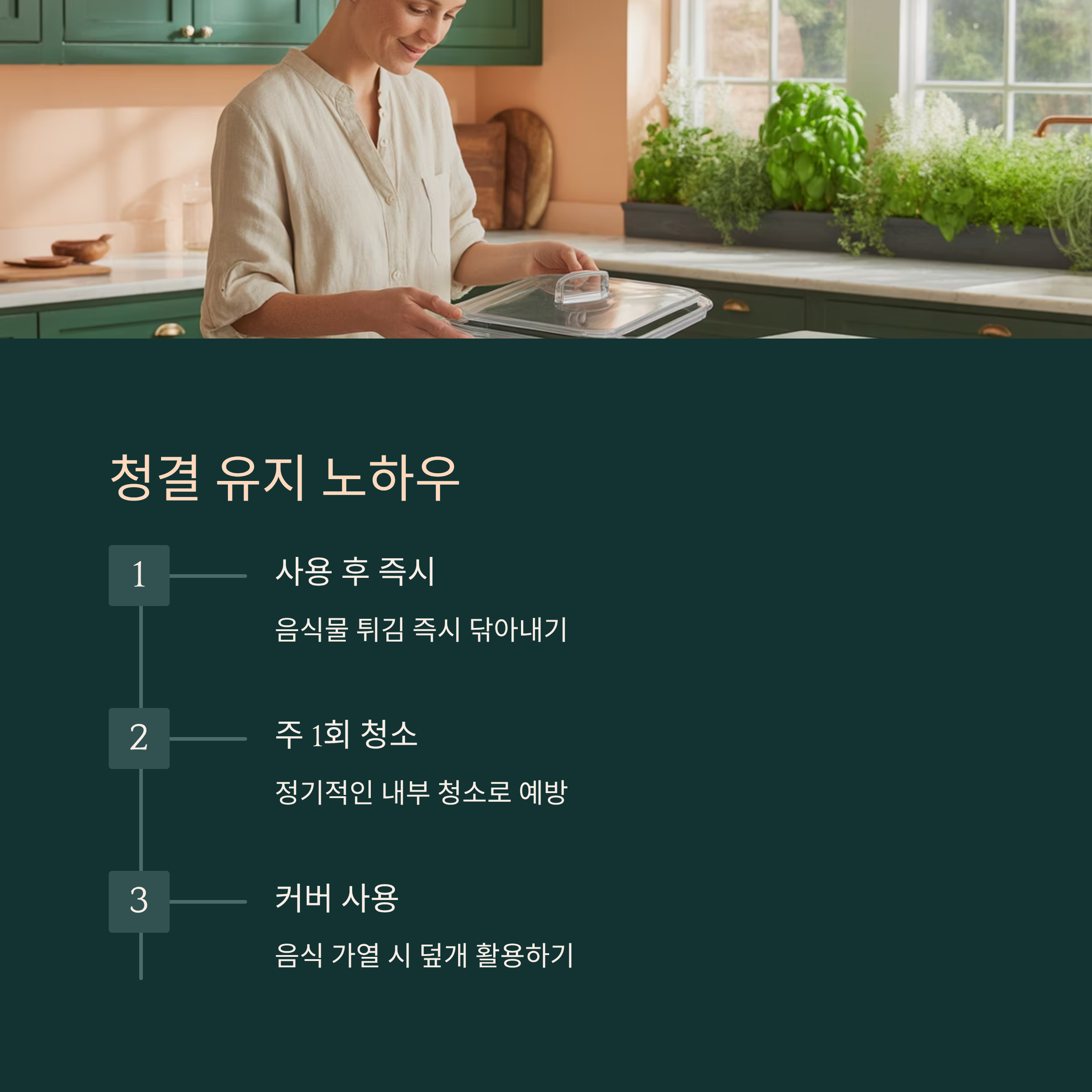 주 1회만이라도 마른 수건이나 키친타월로 내부를 가볍게 닦아주는 습관을 들여보세요. 청소 주기가 길어질수록 찌든 때는 더 단단히 달라붙고, 제거는 어려워진답니다. 바쁜 하루 중 단 3분만 투자하면 되니까요!