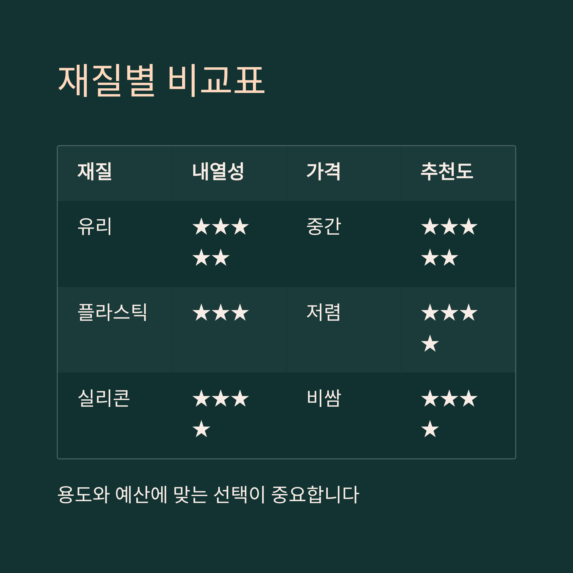용기를 오래 쓰고 싶다면, 사용 후 세척과 보관만큼은 꼭 신경 써주세요. 다음 섹션에서는 지금까지의 내용을 정리한 재질 비교표를 보여드릴게요! 📊