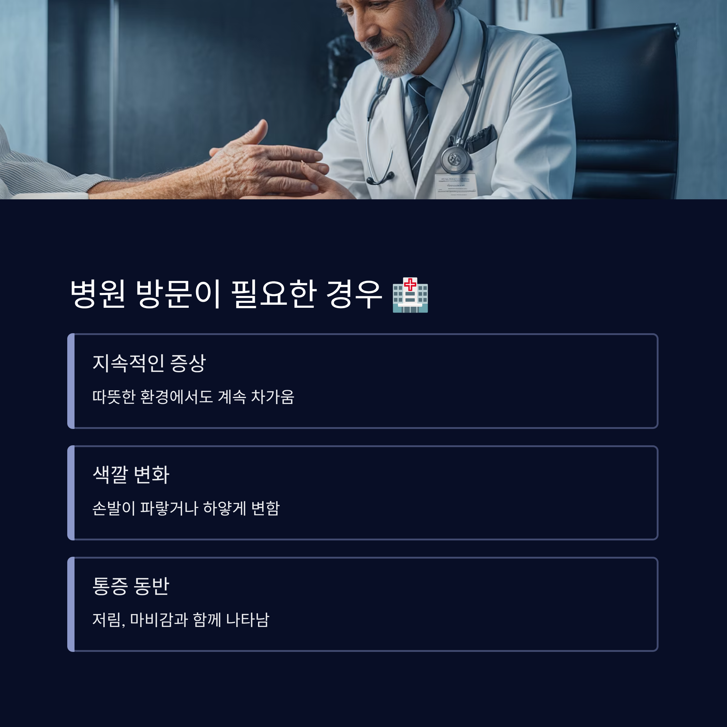 색 변화가 동반되면 해석이 중요해요. 흰색→파란색→붉은색 순환은 레이노 현상과 유사하고, 한쪽 팔다리만 유독 차갑고 보행 시 통증이 있으면 혈관성 문제를 의심해요. 저림·감각 저하가 넓고 지속되면 신경계 원인을 생각하고, 쉽게 피곤하고 체중이 늘고 추위를 참기 어렵다면 갑상샘 검사가 도움이 돼요.