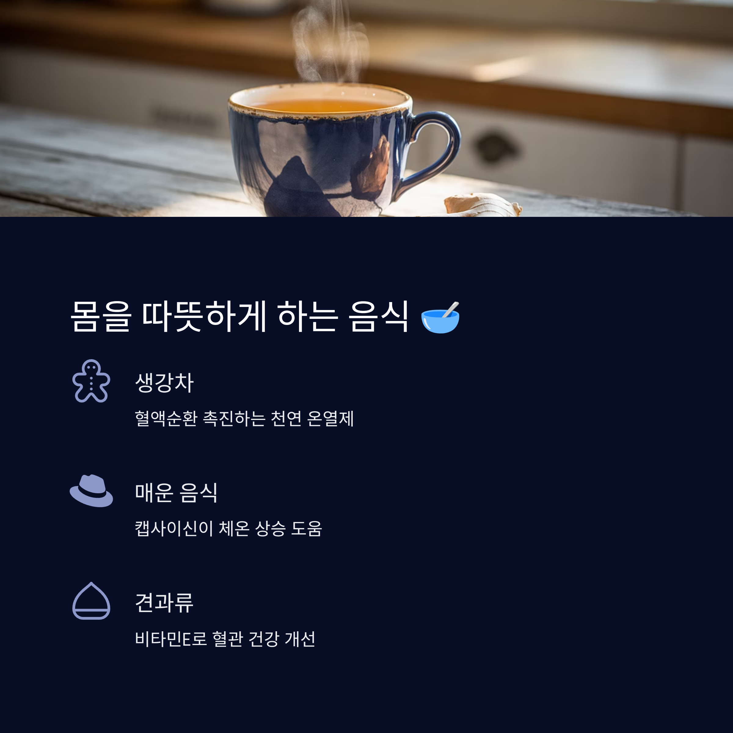 A3. 따뜻한 음료로 체감 온도 상승에 도움이 될 수 있어요. 위가 예민하거나 임신 중이면 양을 줄이고, 약물 복용 중이면 상의가 좋아요.