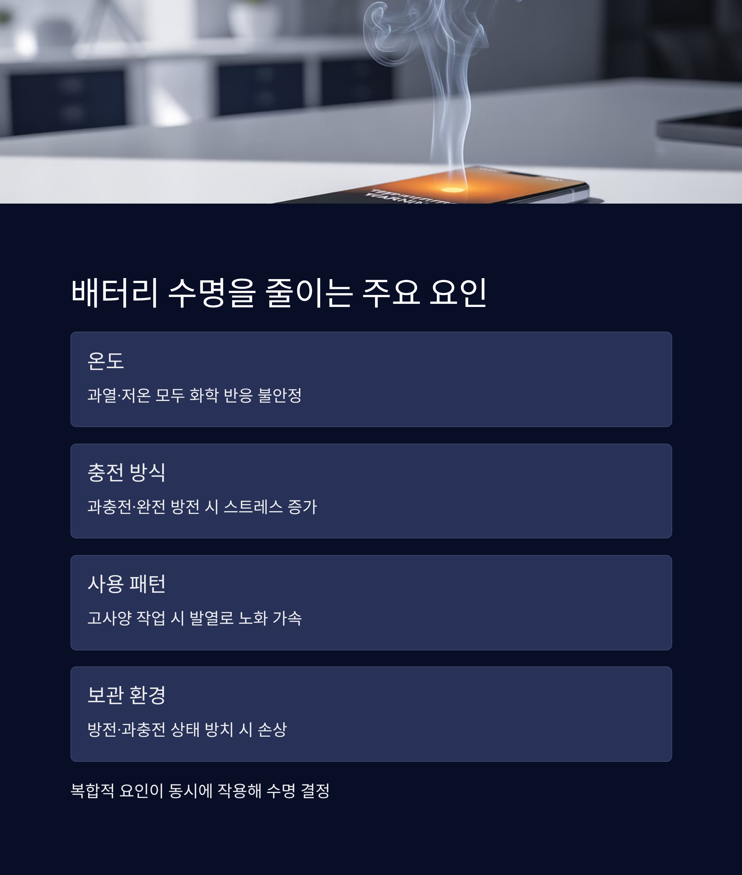 이제 배터리의 원리와 과학을 알았으니, 이어지는 섹션에서는 어떤 요소들이 배터리 수명에 직접적으로 영향을 주는지 깊이 살펴볼 거예요 🔍