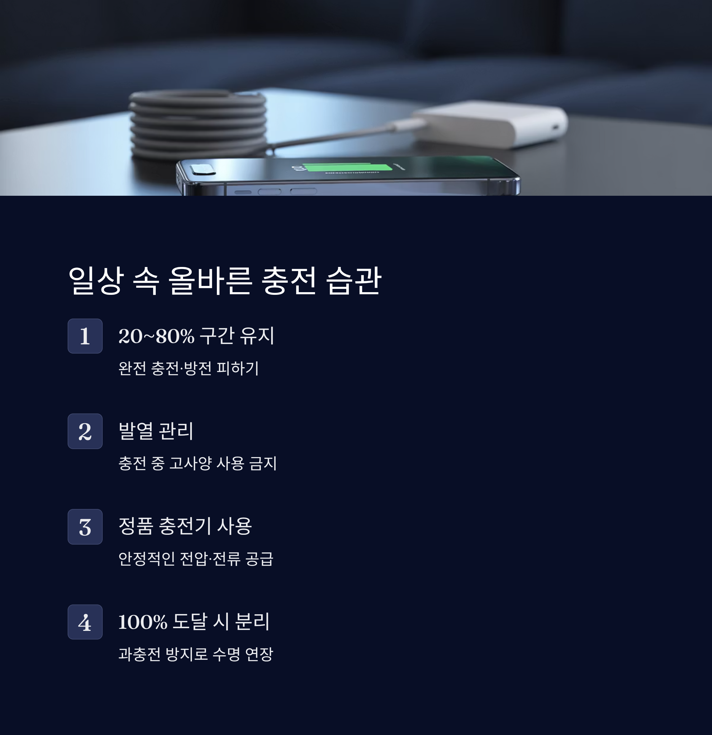 | 온도 | 과열·저온 모두 수명 단축 | 실온 보관, 발열 시 충전 피하기 |