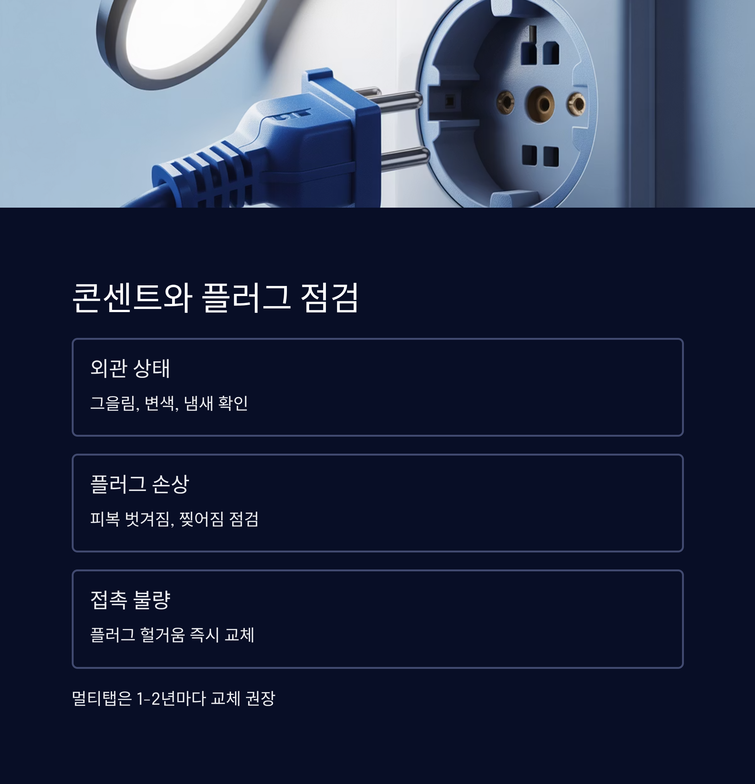 다음으로는 플러그를 확인해요. 코드 부분이 심하게 꺾여 있거나 피복이 벗겨졌다면 그 즉시 교체해야 해요. 특히, 멀티탭은 오래 사용할수록 내부 단선이나 접점 이상이 생기기 쉬워요. 1~2년마다 교체하는 게 좋아요.
