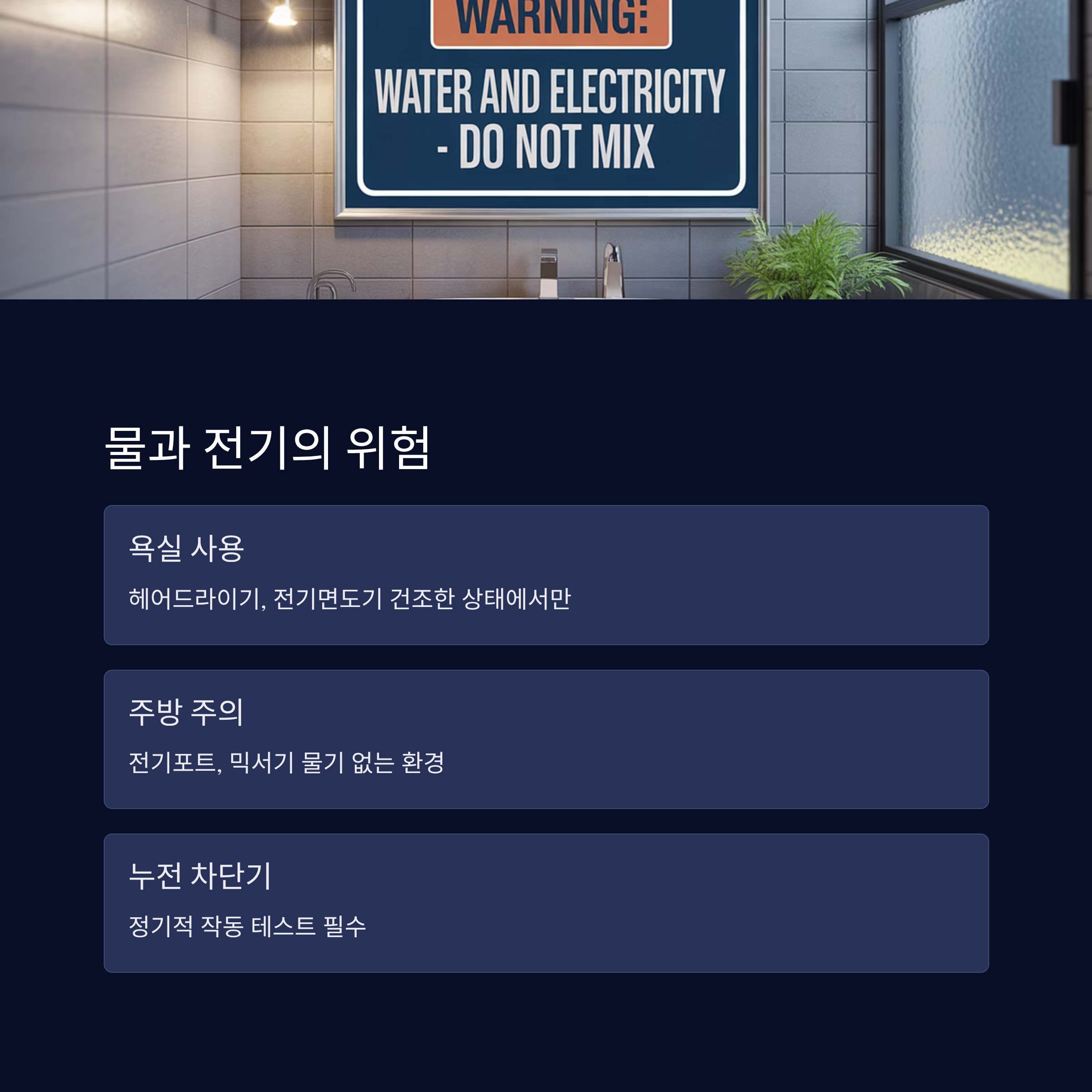 욕실이나 주방처럼 물이 자주 닿는 공간에서 전기를 사용하는 건 매우 위험해요. 물은 전기의 흐름을 도와주는 성질이 있기 때문에, 아주 작은 틈새의 누전만으로도 큰 감전 사고로 이어질 수 있답니다. 😨