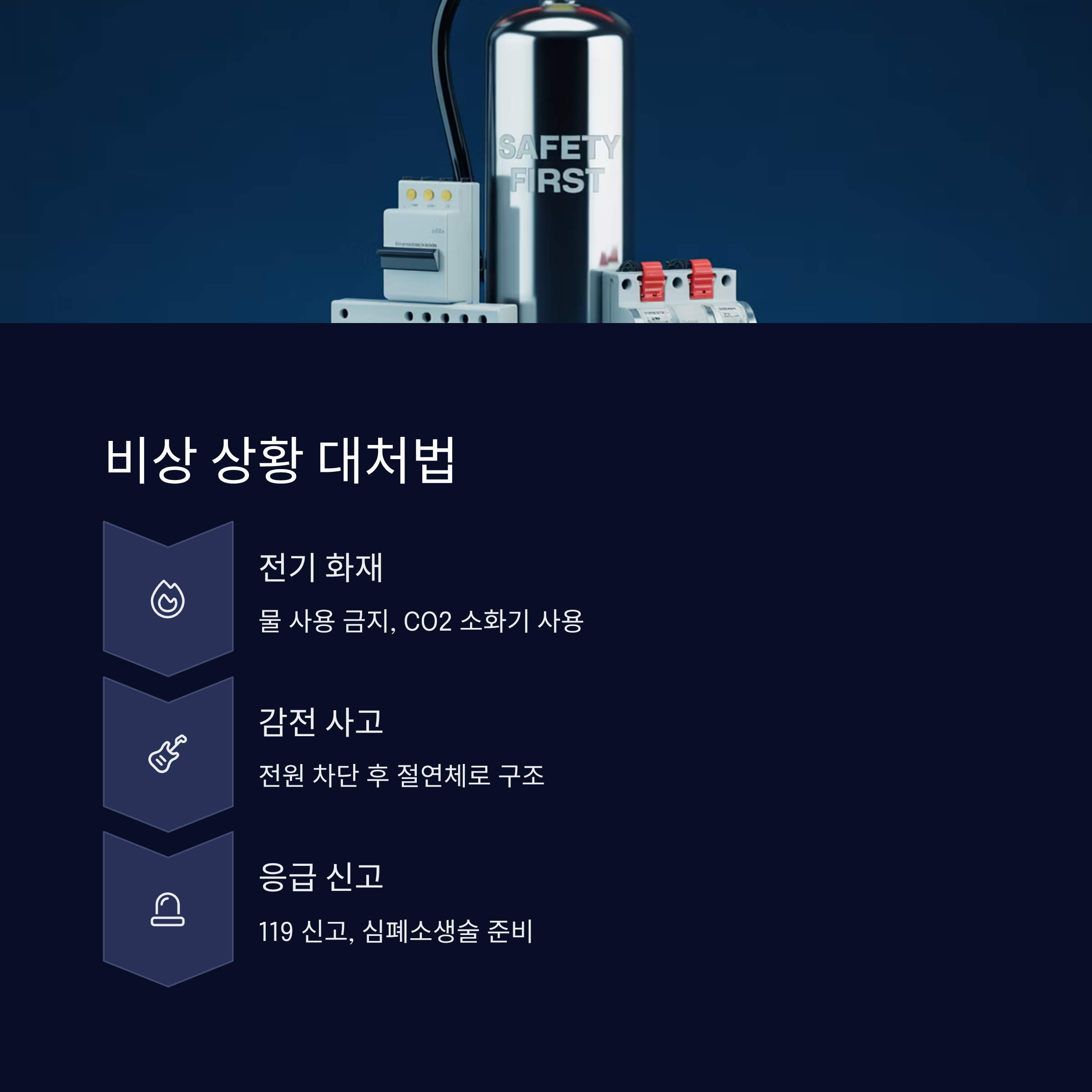 이제 거의 마무리 단계에 왔어요. 다음은 비상 상황이 발생했을 때 우리가 어떻게 대응해야 할지를 알아볼게요. 특히 화재나 감전 사고가 났을 때 당황하지 않고 대처하는 법, 꼭 알고 있어야겠죠? 🚨