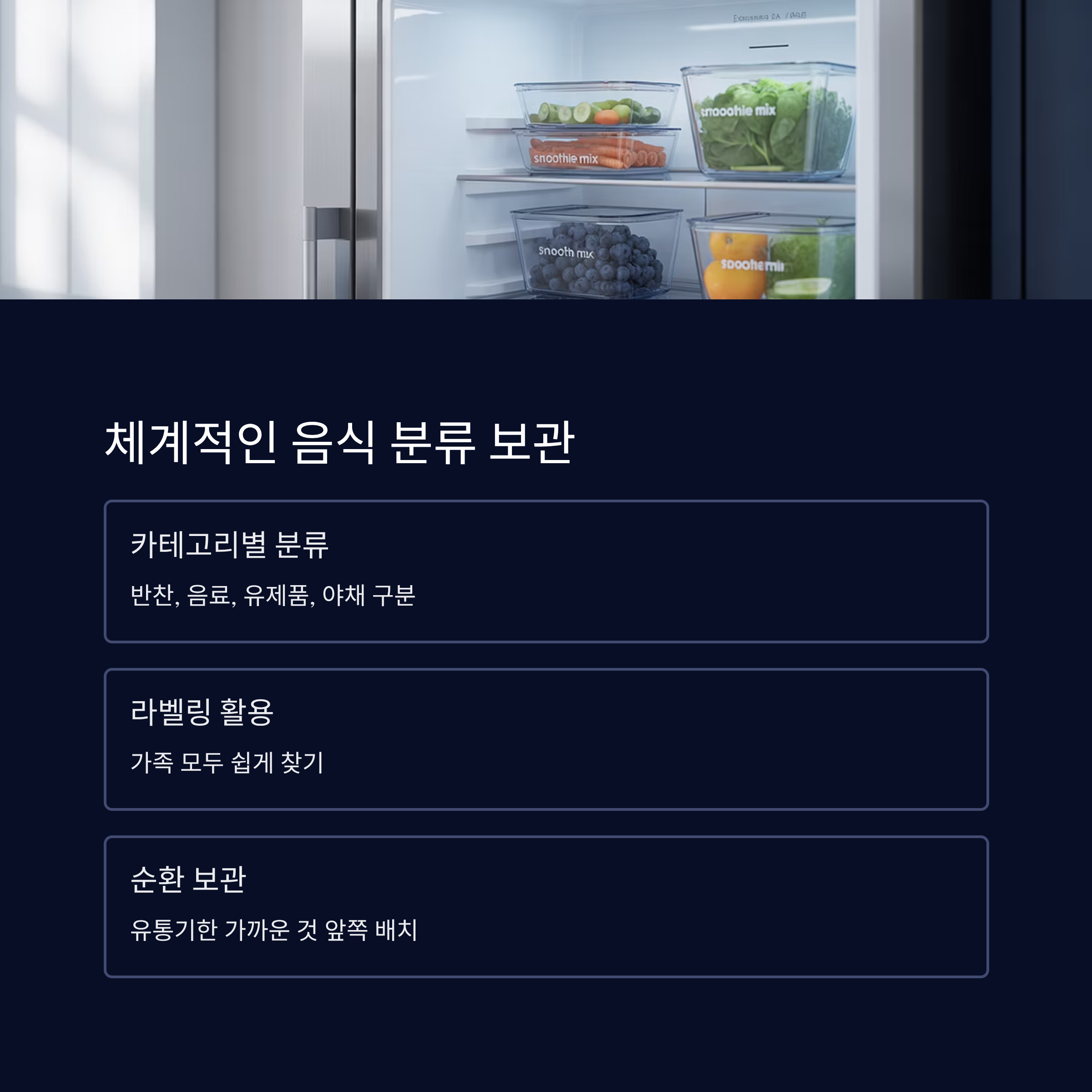 음식 보관도 체계적으로 해두면 문 여닫는 시간과 냉기 손실을 줄일 수 있어요. 특히 같은 종류끼리 분류해 두면 훨씬 편해요.