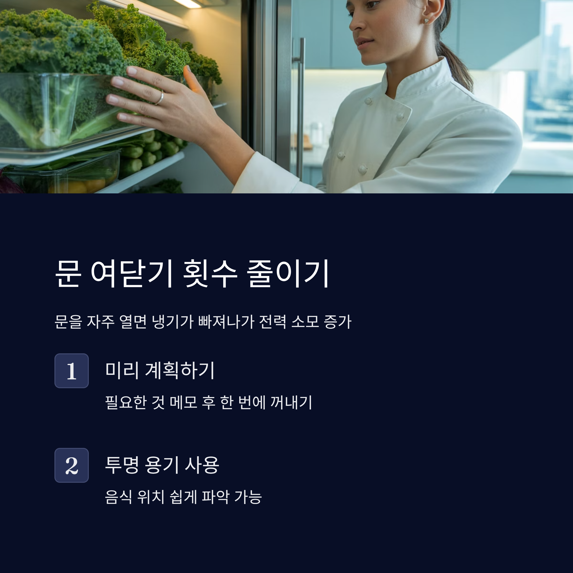 냉장고 문을 자주 열고 닫으면 내부의 냉기가 빠져나가면서 다시 차가워지기 위해 많은 전력을 소모하게 돼요.