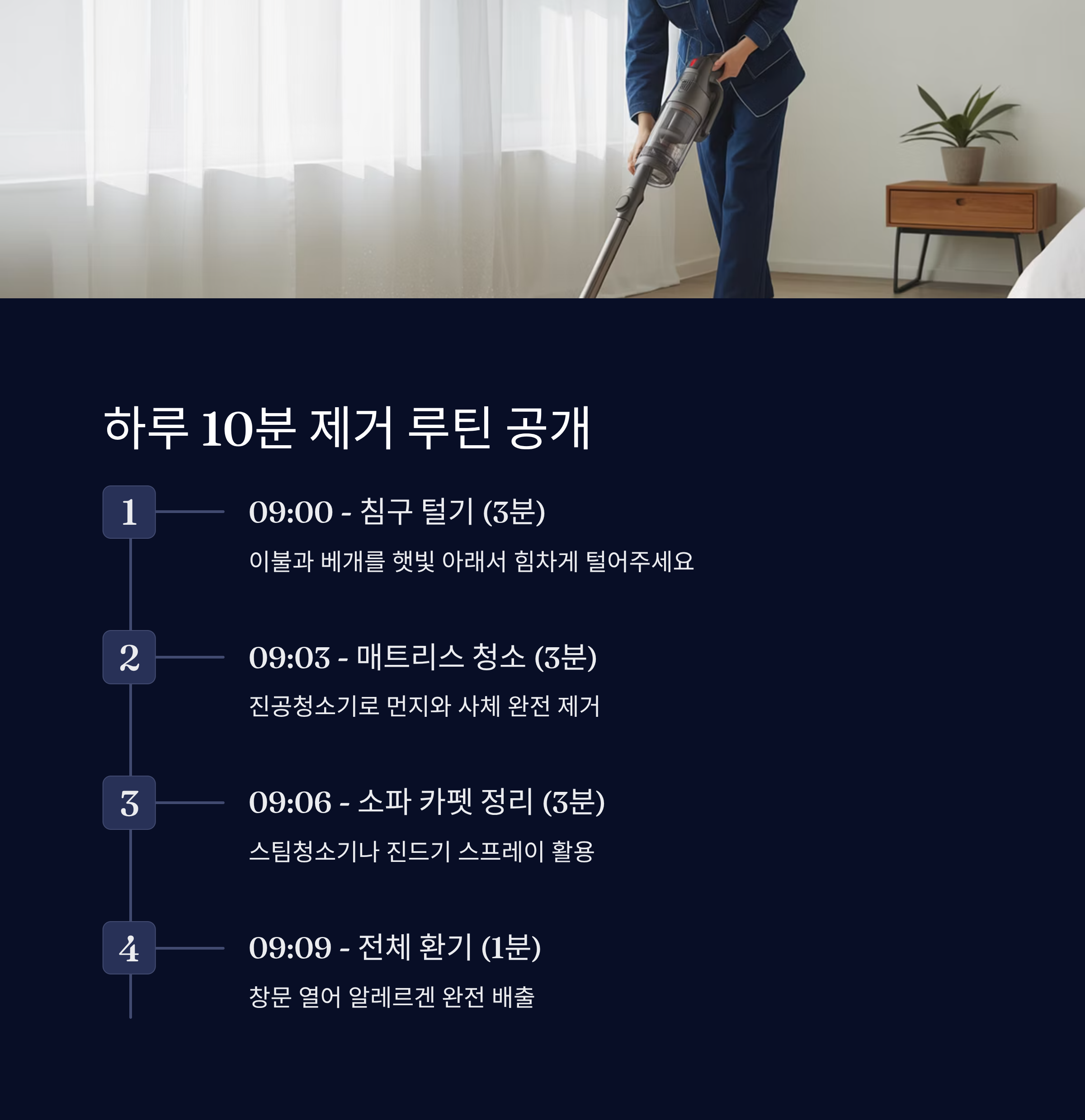 마지막 1분은 창문을 열어 환기시키는 거예요. 공기 중 떠다니는 진드기 알레르겐을 밖으로 내보내는 데 꼭 필요하답니다. 환기는 하루 3번이 이상적이에요!