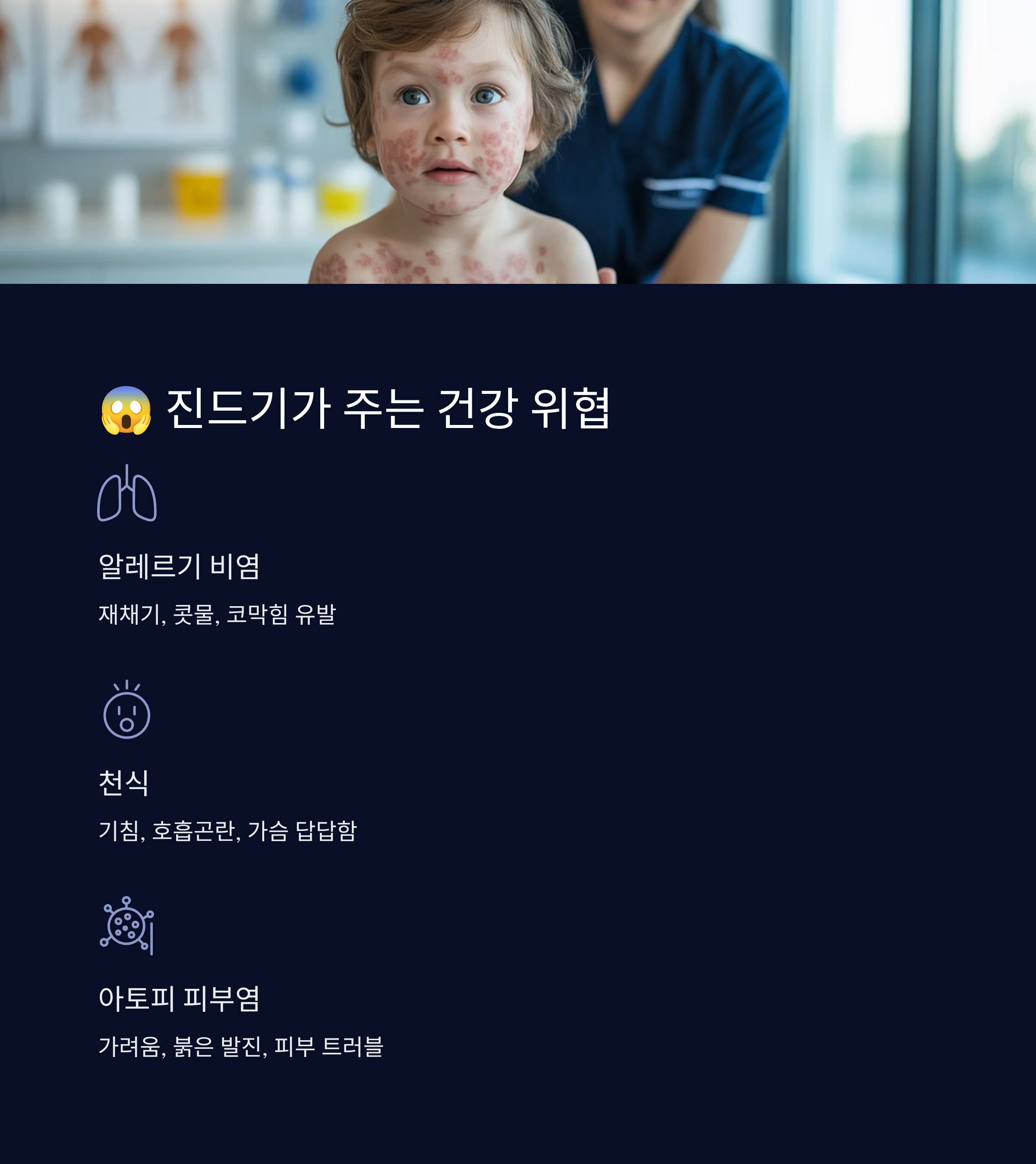 | 아토피 피부염 | 피부 자극 | 가려움, 붉은 발진 |