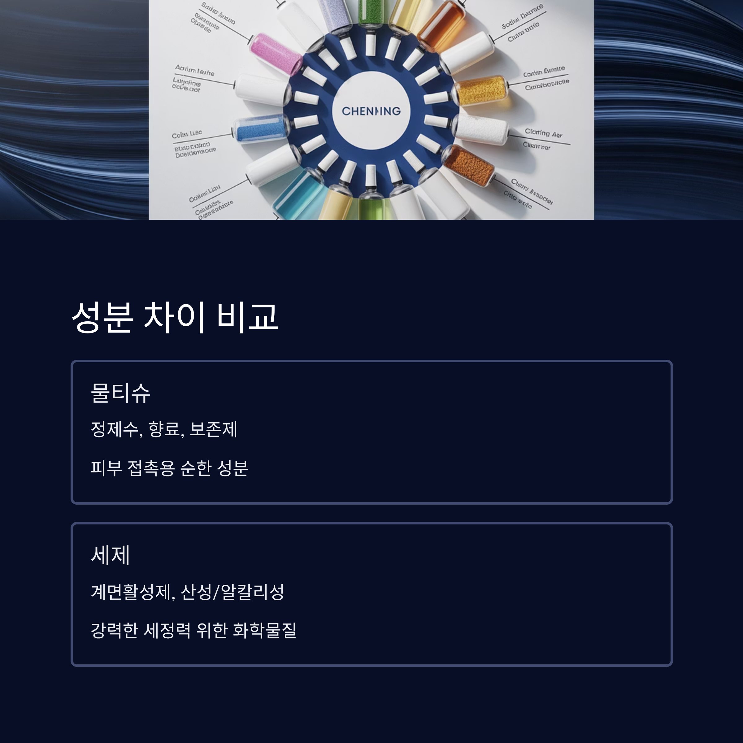 성분을 자세히 보면, 이 둘을 함께 쓰지 말아야 할 이유가 분명히 보여요. 물티슈는 피부에 닿는 제품인 만큼 성분이 순해야 하고, 세제는 오염을 분해하는 강한 성분이 주력이라 둘의 목적 자체가 달라요. ⚠️