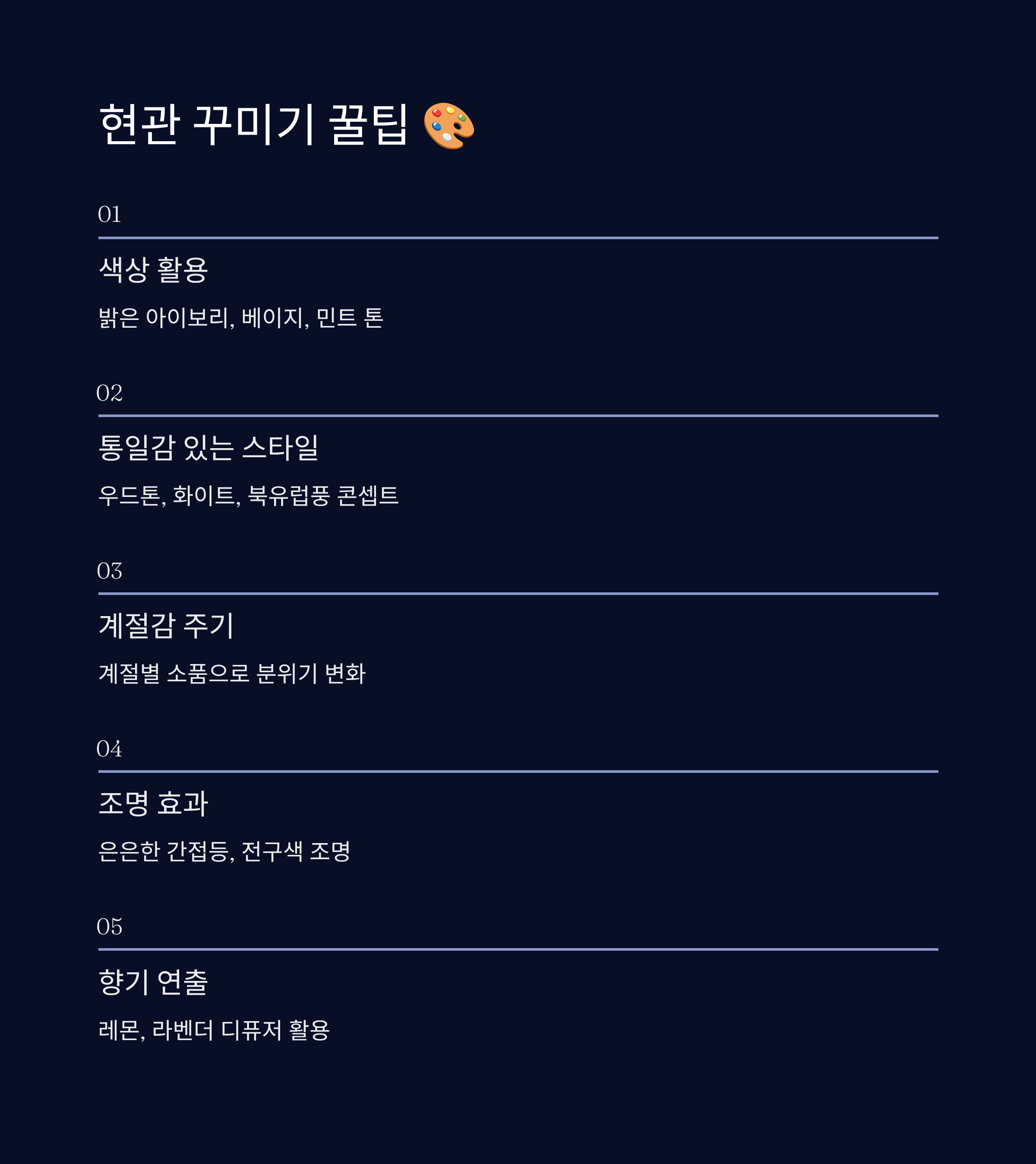 향기 역시 중요해요. 디퓨저나 방향제를 두면 현관문을 여는 순간 기분이 좋아져요. 상쾌한 레몬향, 편안한 라벤더향 등이 인기 많고, 계절에 따라 바꿔주는 것도 좋아요.