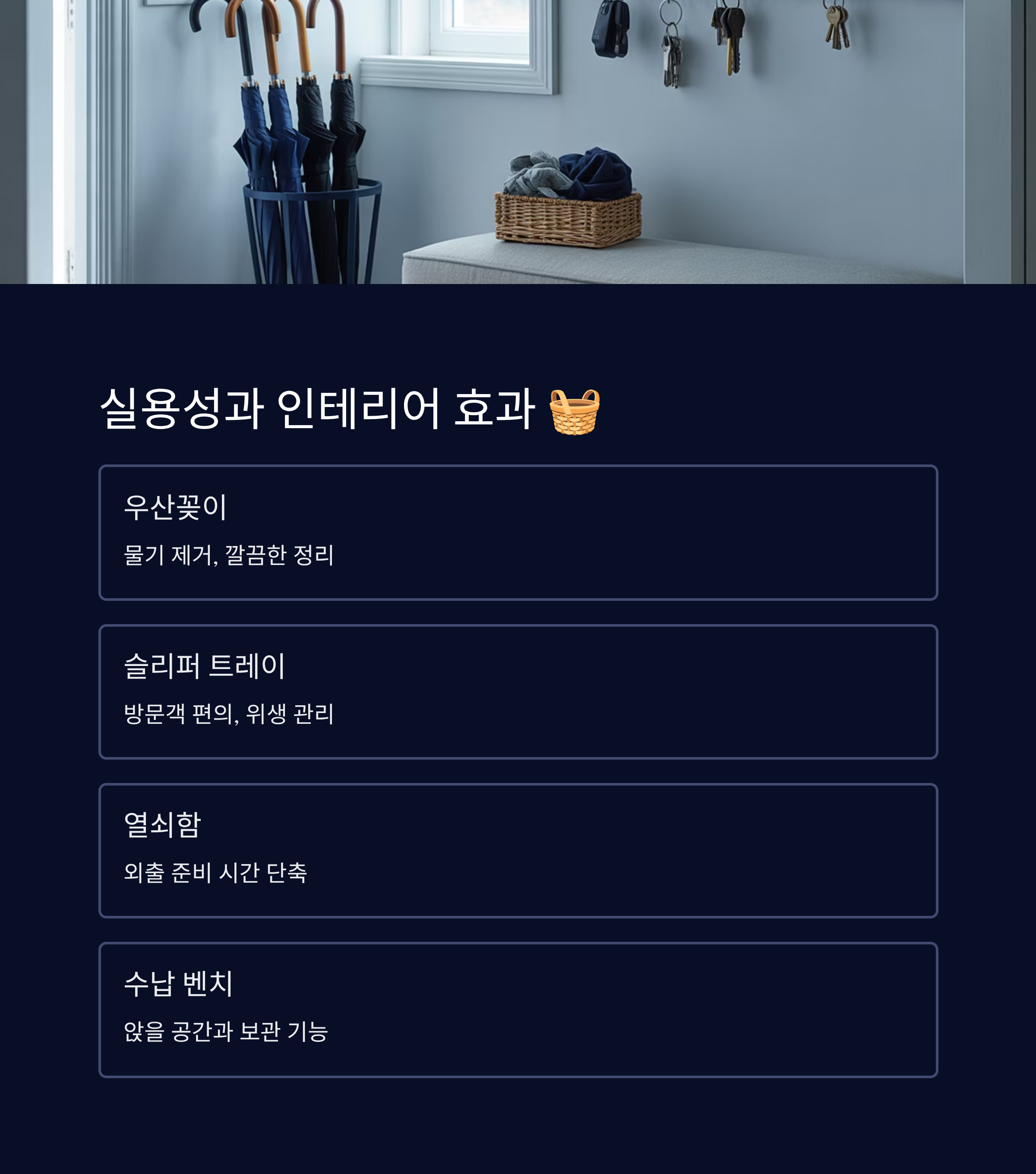 현관은 실용적인 물건을 잘 배치하면 공간 활용도는 물론, 집 전체의 분위기까지 달라질 수 있어요. 단순히 예쁜 것이 아니라 ‘쓸모 있으면서도 예쁜 것’이 최고의 선택이죠.