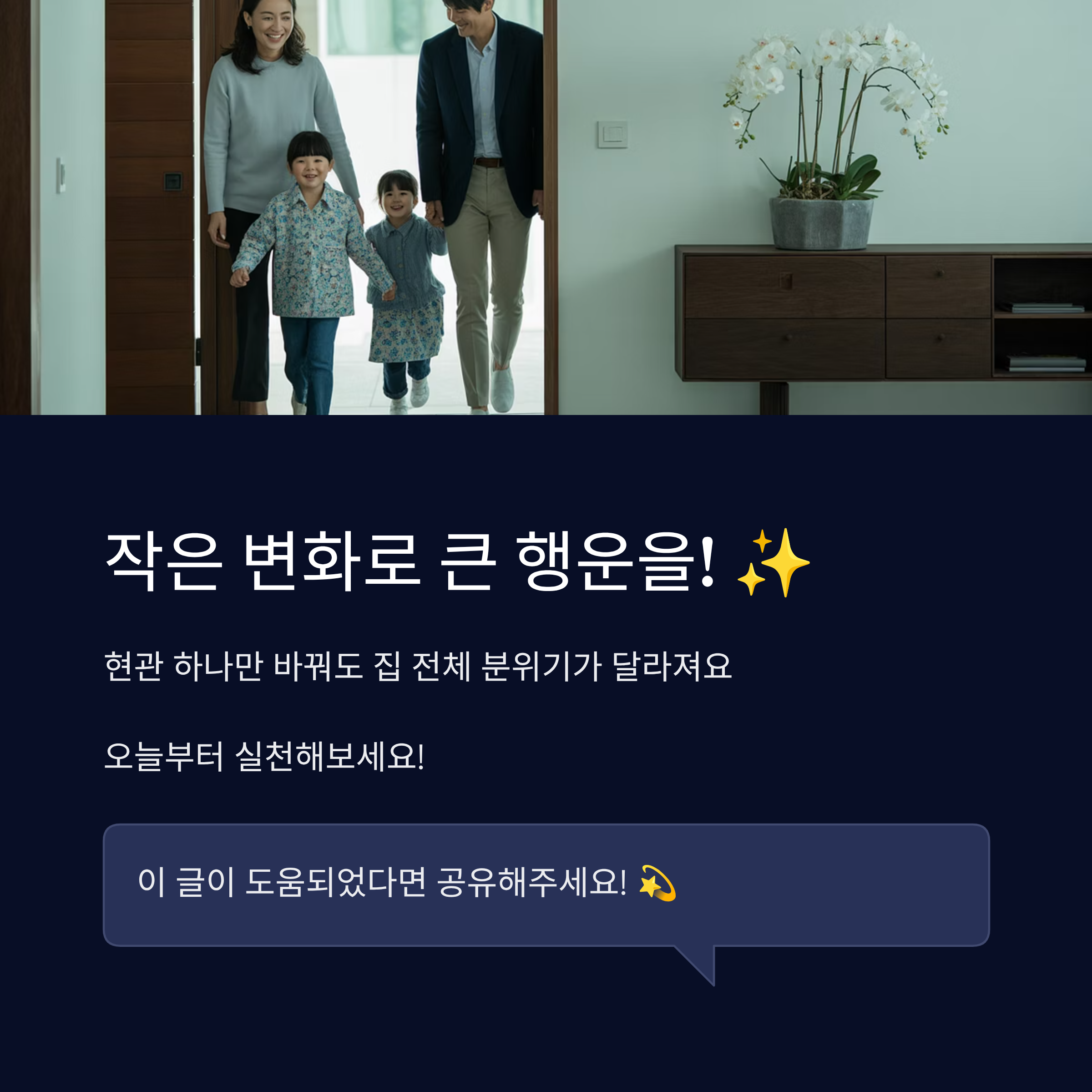 이처럼 현관은 단순한 출입구를 넘어, 가족과 집의 에너지를 모으는 중요한 장소예요. 작은 소품 하나가 큰 변화를 가져올 수 있다는 점을 기억하면 좋아요 😊