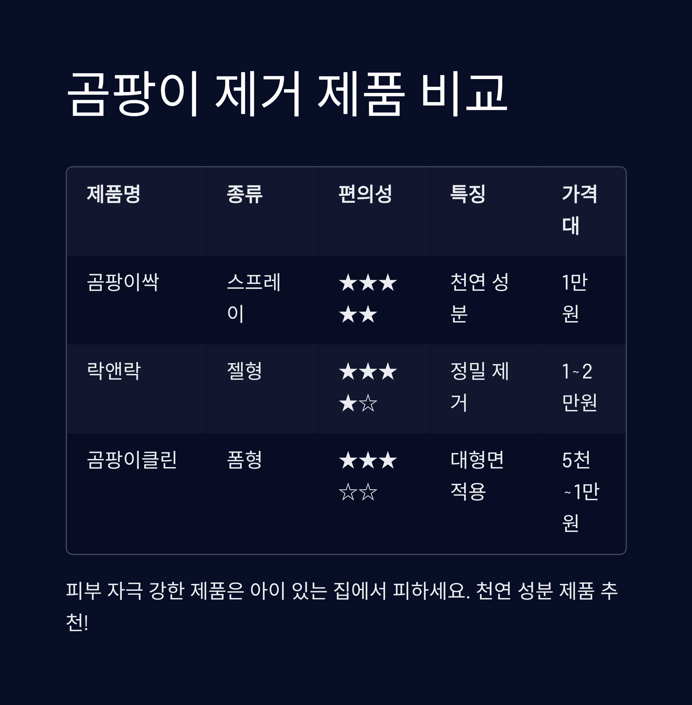 | 곰팡이싹 | 스프레이 | ★★★★★ | 천연 성분, 벽지 사용 가능 | 1만원 내외 |