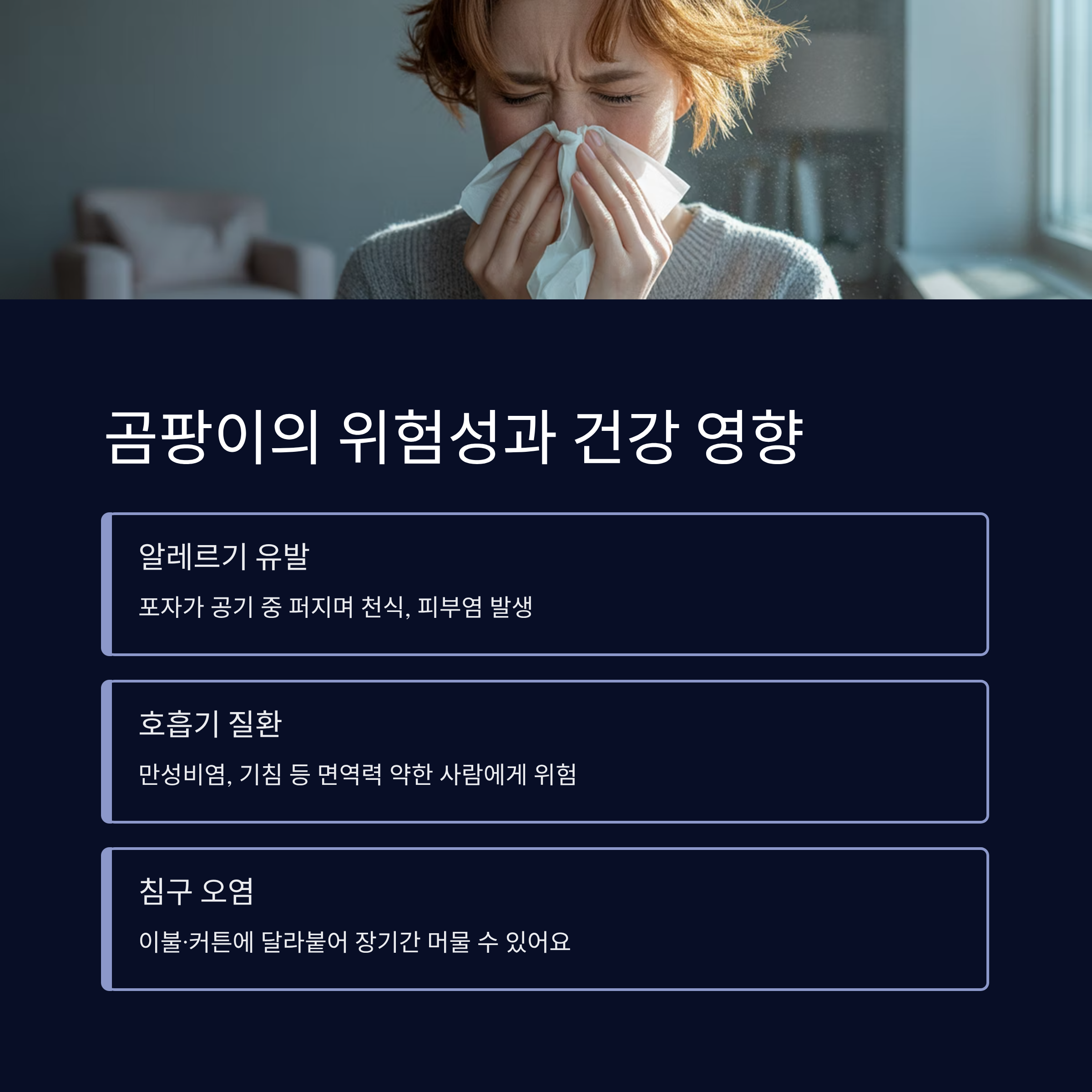 곰팡이는 단순한 얼룩이 아니에요. 눈에 보이지 않는 포자들이 공기 중으로 퍼지면서 알레르기, 천식, 피부염, 눈 가려움 등 각종 질환을 유발할 수 있어요. 특히 아이들이나 면역력이 약한 사람에게는 더욱 위험하죠.