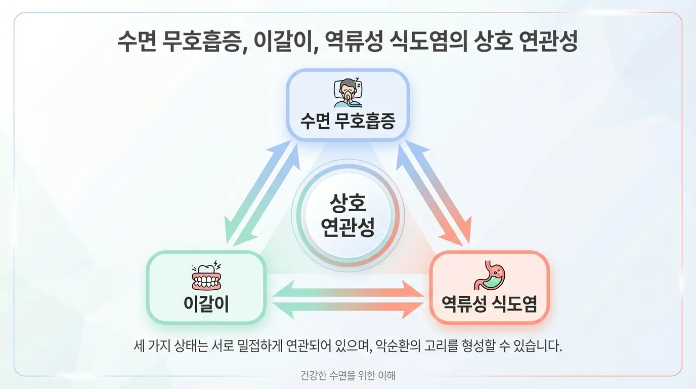 흥미로운 건, 이 세 가지 질환이 서로 독립적이지 않다는 점이에요. PMC(PubMed Central)에 2025년 발표된 리뷰 논문에 따르면, 수면 이갈이(SB), 폐쇄성 수면무호흡(OSA), 위식도역류질환(GERD)은 "단독으로 존재하는 경우가 드물고, 복합적 네트워크를 형성한다"고 명시했습니다. 그래서 이갈이 하나만 치료해서는 근본 해결이 안 되는 경우가 많은 거죠.